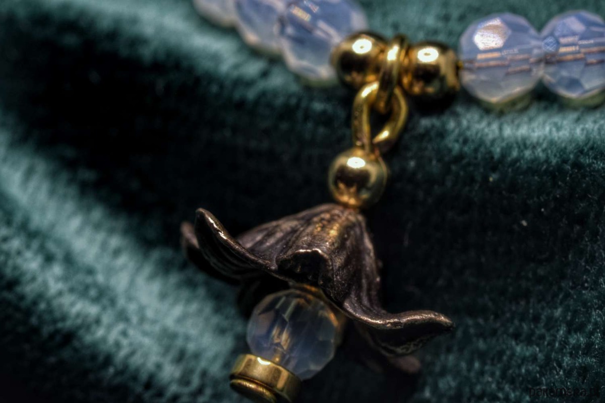 Naszyjnik wykonany z opali z dwoma ozdobnikami z brązu własnego projektu: kwiatek-dzwonek i koralik ze wzorkiem z projektu "Szlakiem krętym". Linka stalowa.