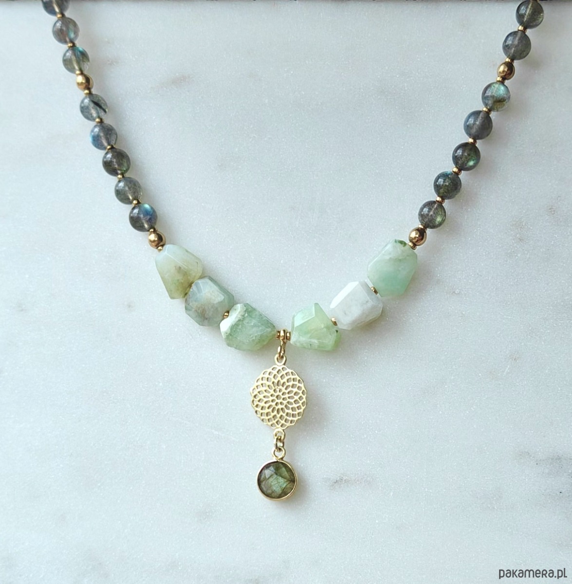 Naszyjnik z pięknie opalizującego labradorytu oraz stonowanego chryzoprazu. Kamienie emanują światłem, które w zależności od pory dnia ukazuje różne odcienie. Zawieszka z labradorytu ma złocistą opalizację.