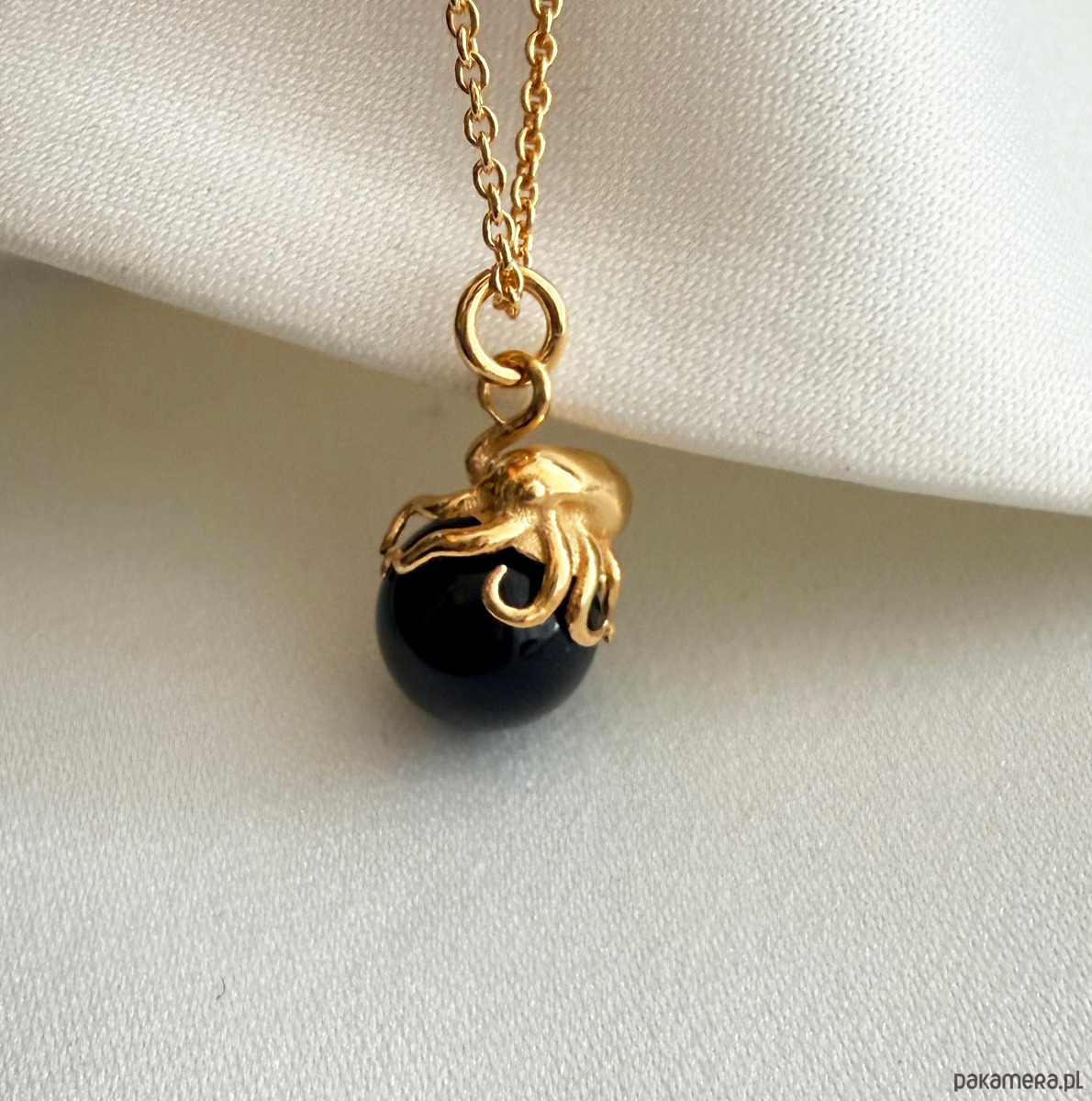 Piękny naszyjnik z wyjątkową zawieszką w kształcie ośmiornicy, która subtelnie oplata perłę. Zachwyca realistycznym wykonaniem oraz dbałością o detale.Jego delikatna, a zarazem wyrazista forma inspirowana naturą przywodzi na myśl letnie chwile spędzone nad brzegiem oceanu.