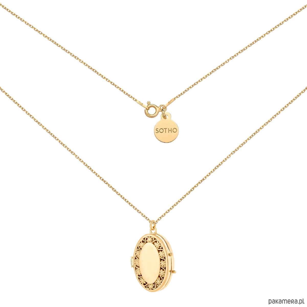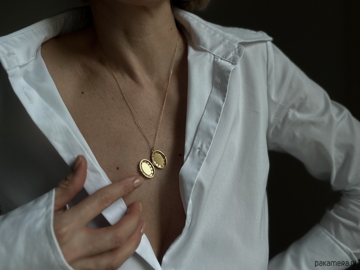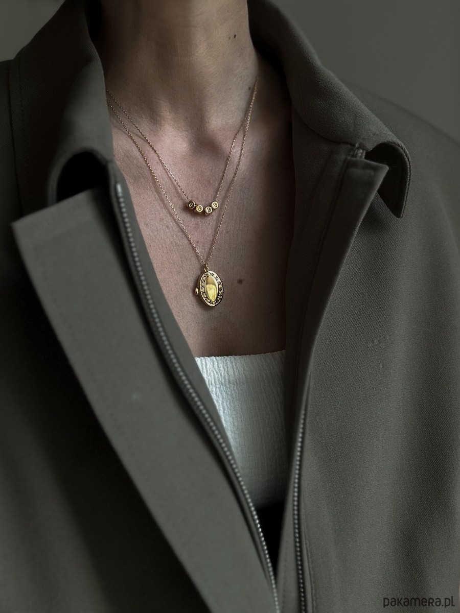 Złoty naszyjnik zdobiony owalnym sekretnikiem i z zawieszką z logo marki. Całość wykonana ze srebra 925 powlekanego 24 karatowym żółtym złotem.
