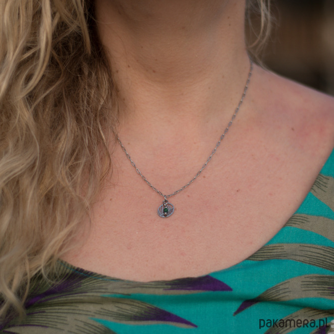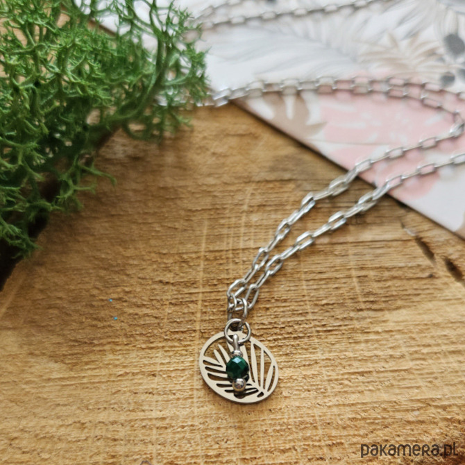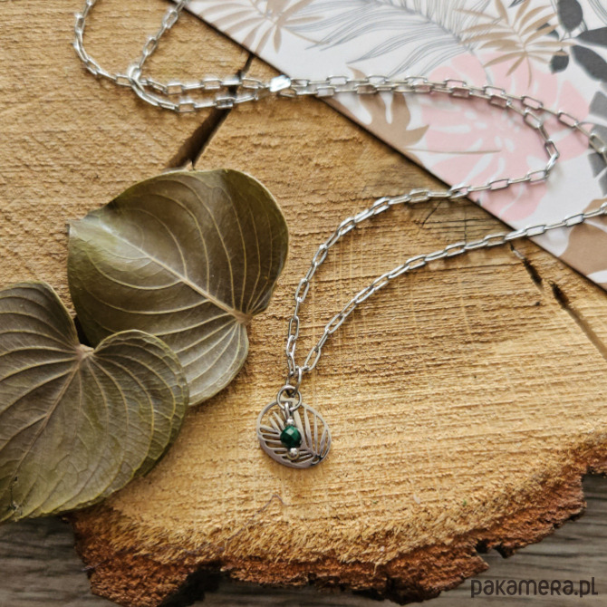 Naszyjnik z wakacyjnym motywem palmy oraz malutkim, ciemnozielonym malachitem to delikatna biżuteria idealna na lato! Łańcuszek oraz zawieszka wykonane zostały ze stali szlachetnej, będącej wytrzymałym i antyalergicznym materiałem. Świetnie więc sprawdzi się na prezent!