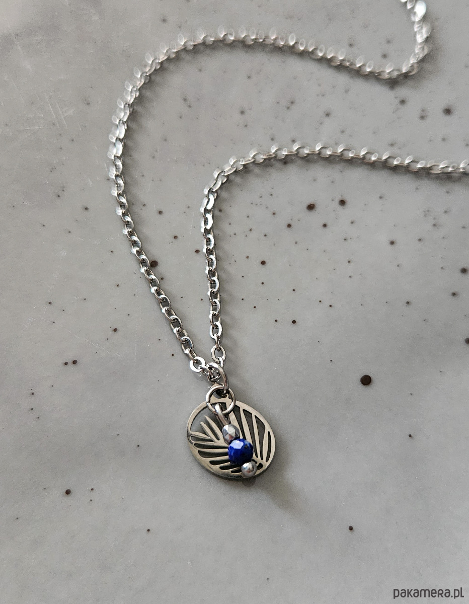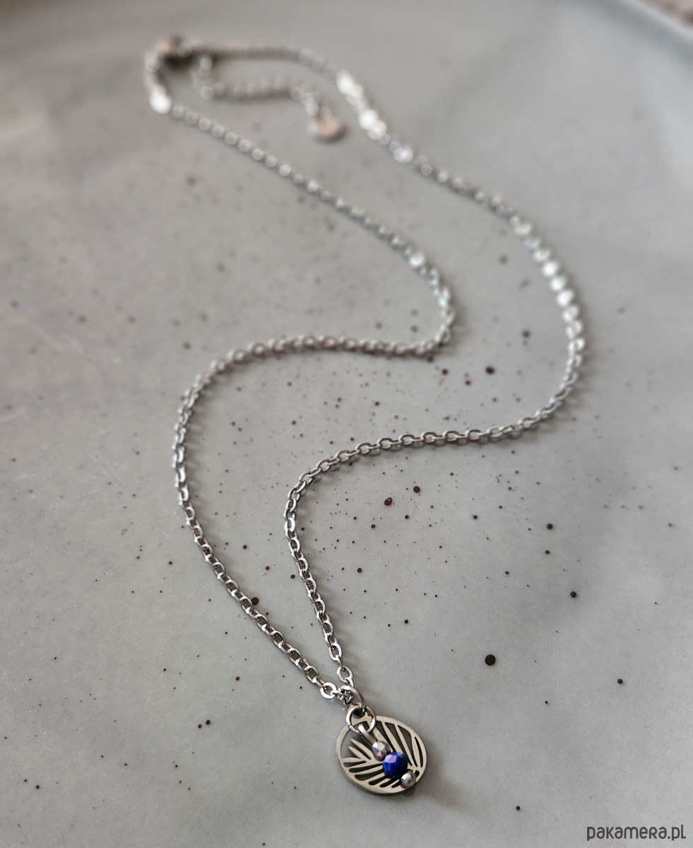 Naszyjnik z wakacyjnym motywem palmy oraz malutkim, ciemnoniebieskim lapis lazuli to delikatna biżuteria idealna na lato! Łańcuszek oraz zawieszka wykonane zostały ze stali szlachetnej, będącej wytrzymałym i antyalergicznym materiałem. Świetnie więc sprawdzi się na prezent!