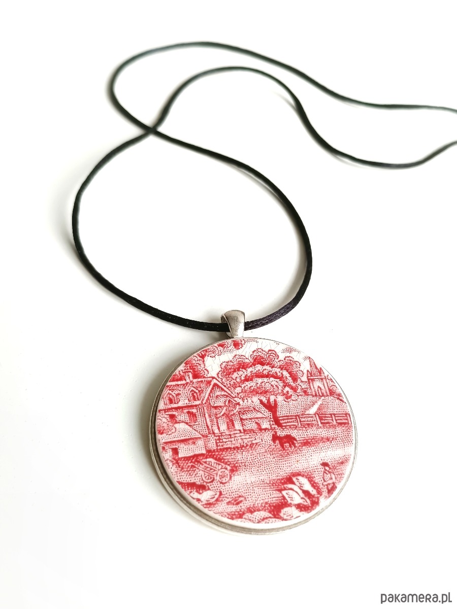 Wyjątkowy naszyjnik, który wykoanałam z fragmentu stłuczonego talerza Villeroy & Boch Burgenland w czerwone wzory z motywem pejzażu wiejskiego. Fragment oszlifowałam w okrągły kształt i osadziłam w metalowej bazie w kolorze srebrnym. Ceramikę zeszlifowałam również z grubości - jest cieńsza niż pierwotnie, dzięki czemu wisior nie jest masywny. Brzegi pokryłam lakierem, co sprawia, że nie brudzą się i nie chłoną wilgoci. Do zawieszki dobrałam satynowy sznureczek w kolorze czarnym. Średnica elementu ceramicznego: 45 mm. Długość sznureczka w całości: ok. 80 cm (naszyjnik zakłada się przez głowę). Sznurek łatwo skrócić lub dobrać swój ulubiony rzemień lub łańcuszek. Upcykling - nie reprodukuję wykorzystywanych wzorów, niczego nie domalowuję - wykorzystuję wyłącznie oryginalne naczynia i motywy, które się na nich znajdują. Tym samym, stłuczce z odzysku nadaję nowe życie.