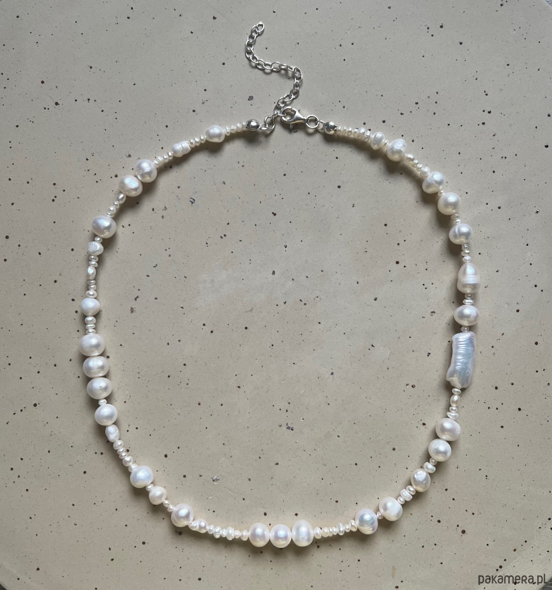 Minimalistyczny naszyjnik wykonany z nieregularnych pereł hodowlanych. Elementy zapięcia zostały wykonane ze srebra próby 925. Długość naszyjnika 40 + 5 cm przedłużki. Każdy naszyjnik HAVANA jest unikatowy.