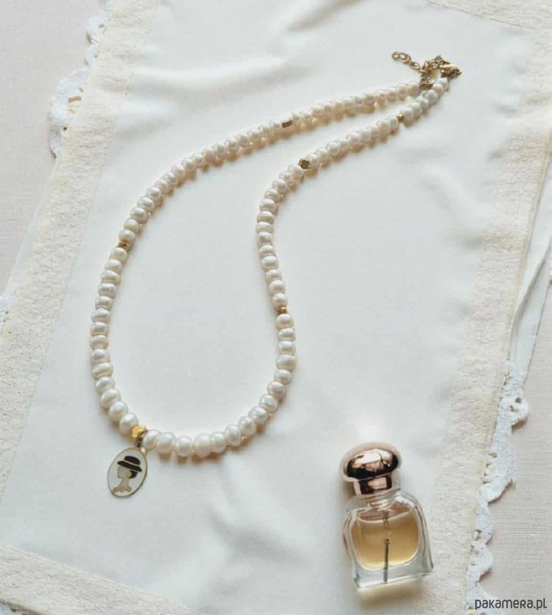 Wyjątkowy i pełen klasy — naszyjnik z pereł naturalnych z elegancką zawieszką ze stali szlachetnej z wizerunkiem damy.