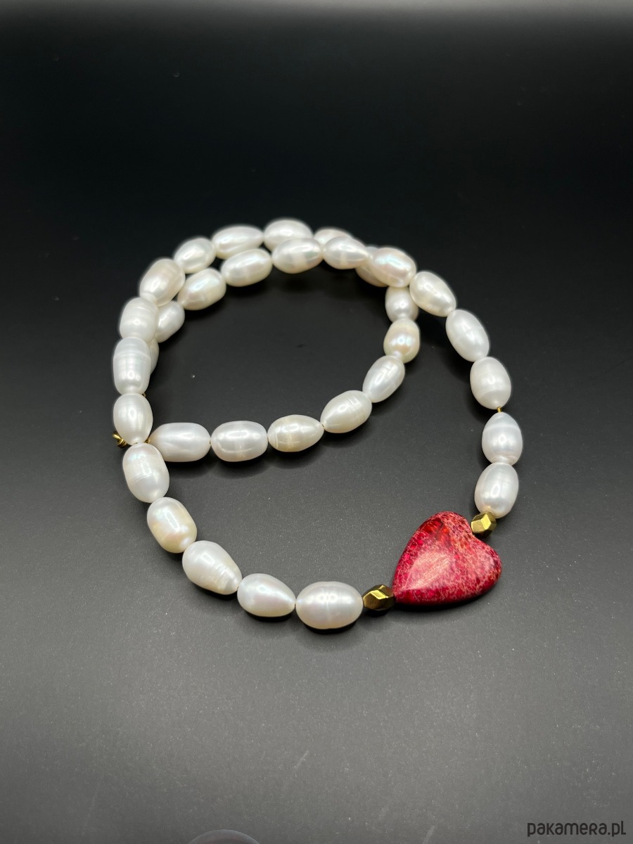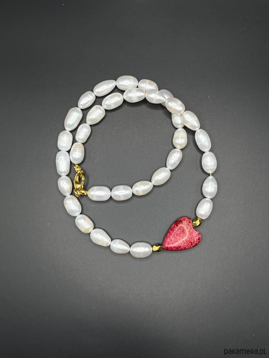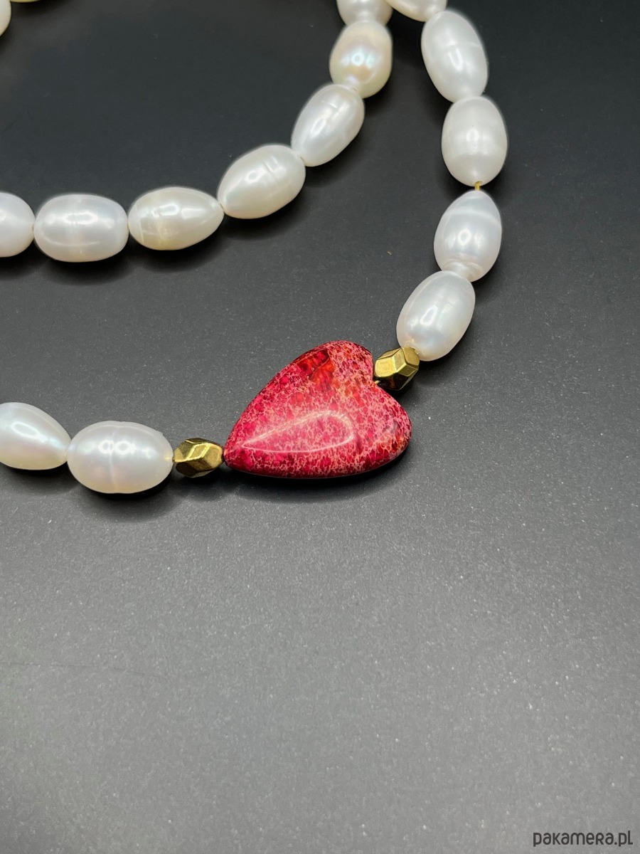 Naszyjnik z pereł hodowlanych w wersji choker z sercem z jaspisu cesarskiego.