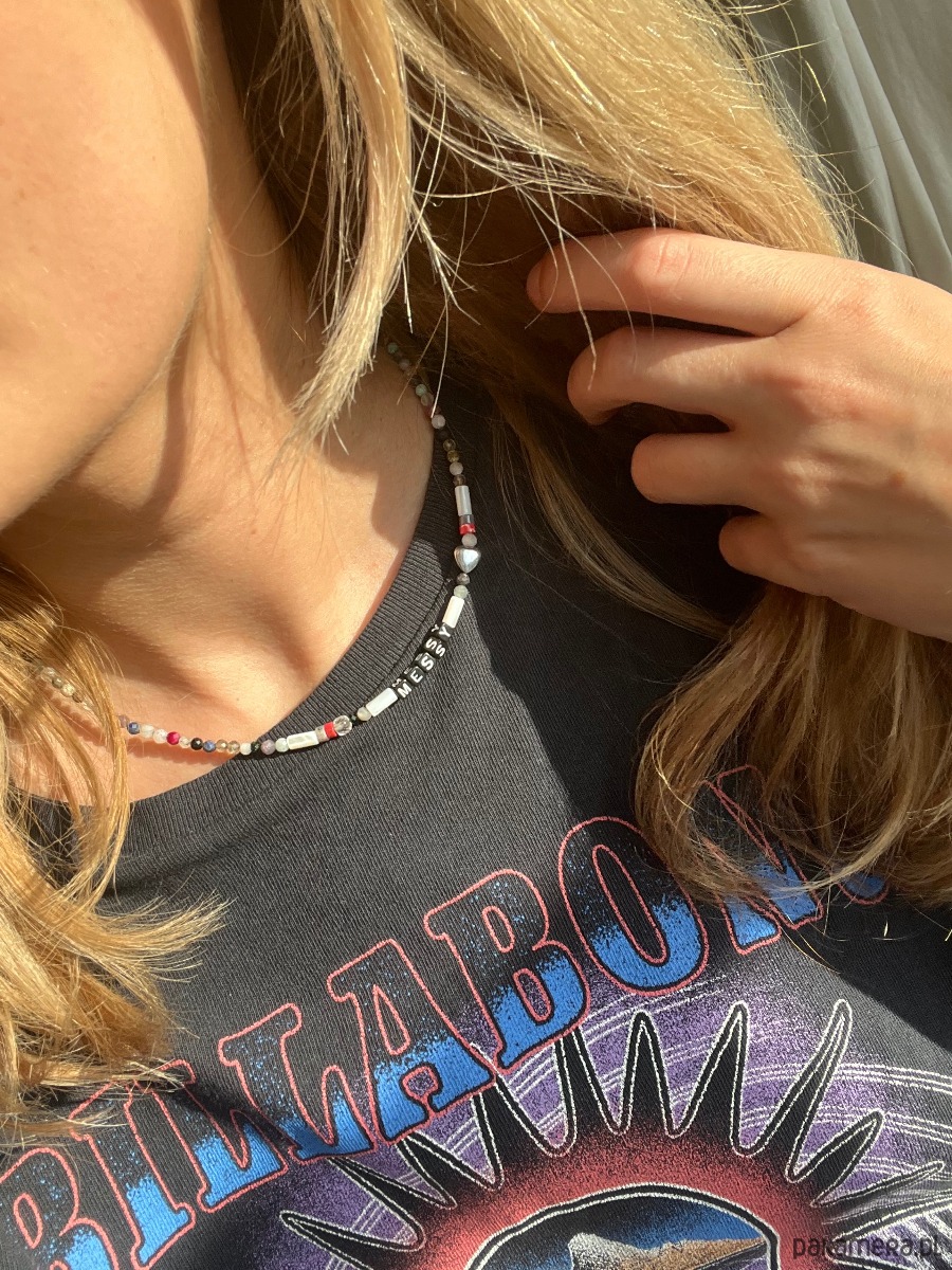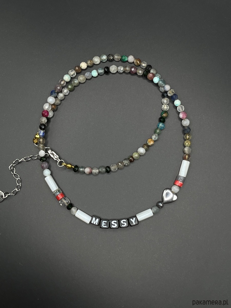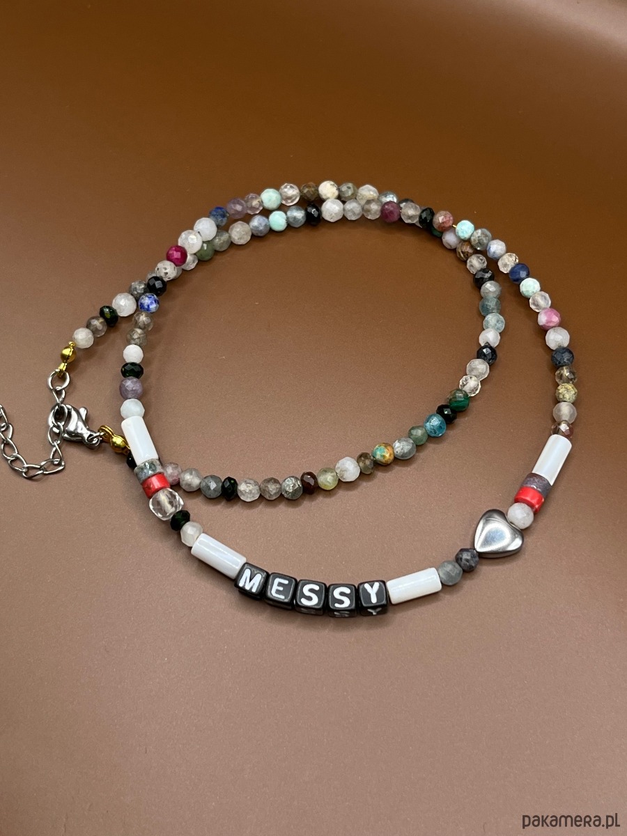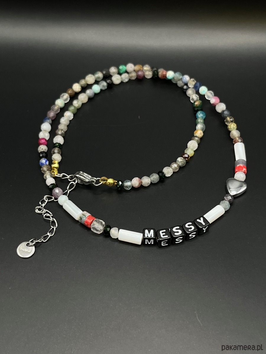 Naszyjnik z fasetowanych kamienie naturalnych (agat, jadeit, kryształ górski)i koralików z masy perłowej i szkła oraz przekładek z plastikowych kostek z hasłem „messy”.
