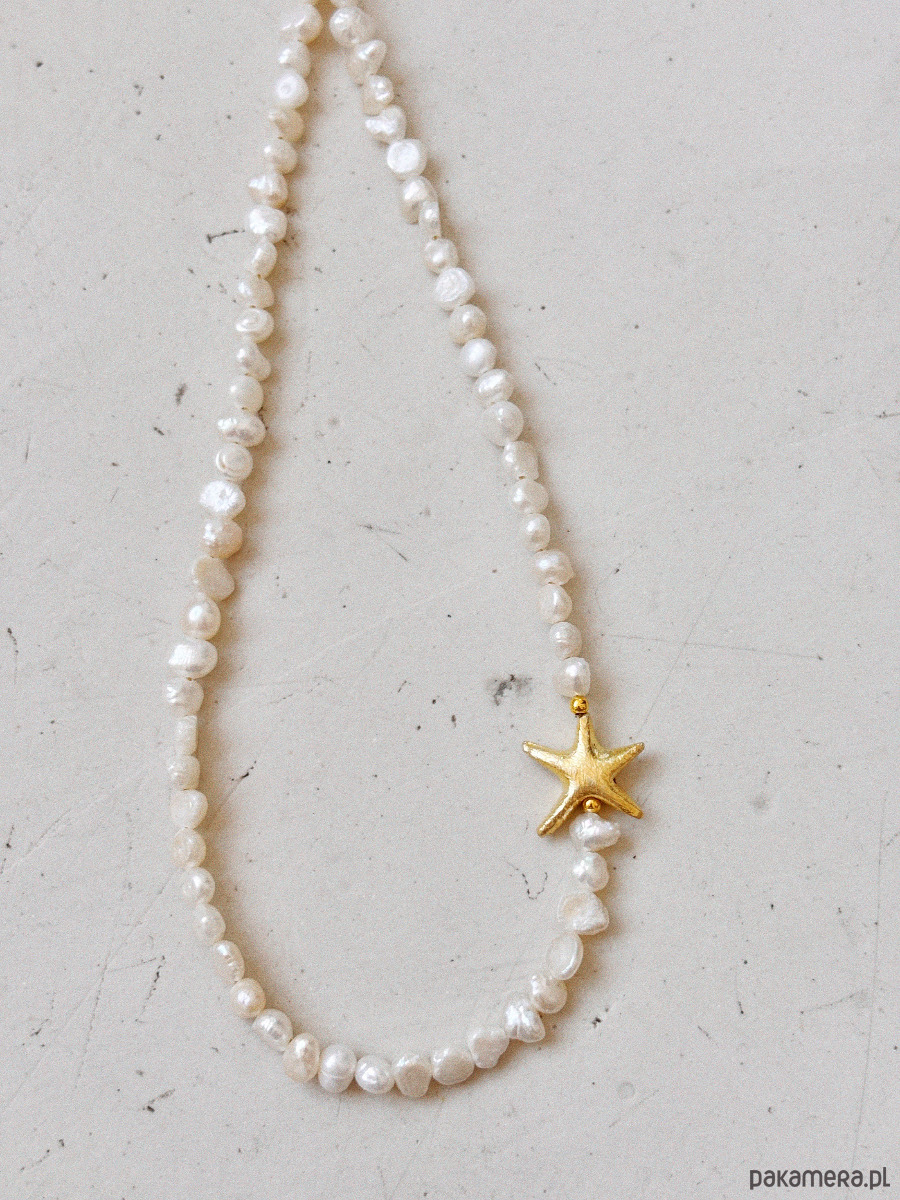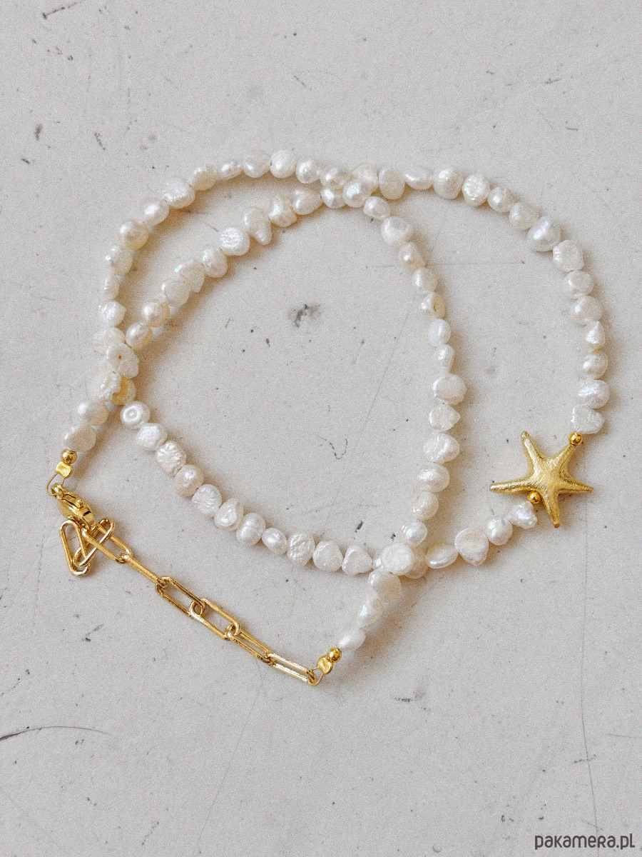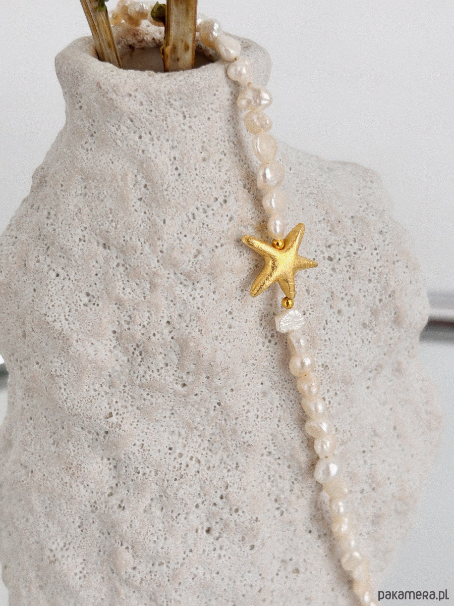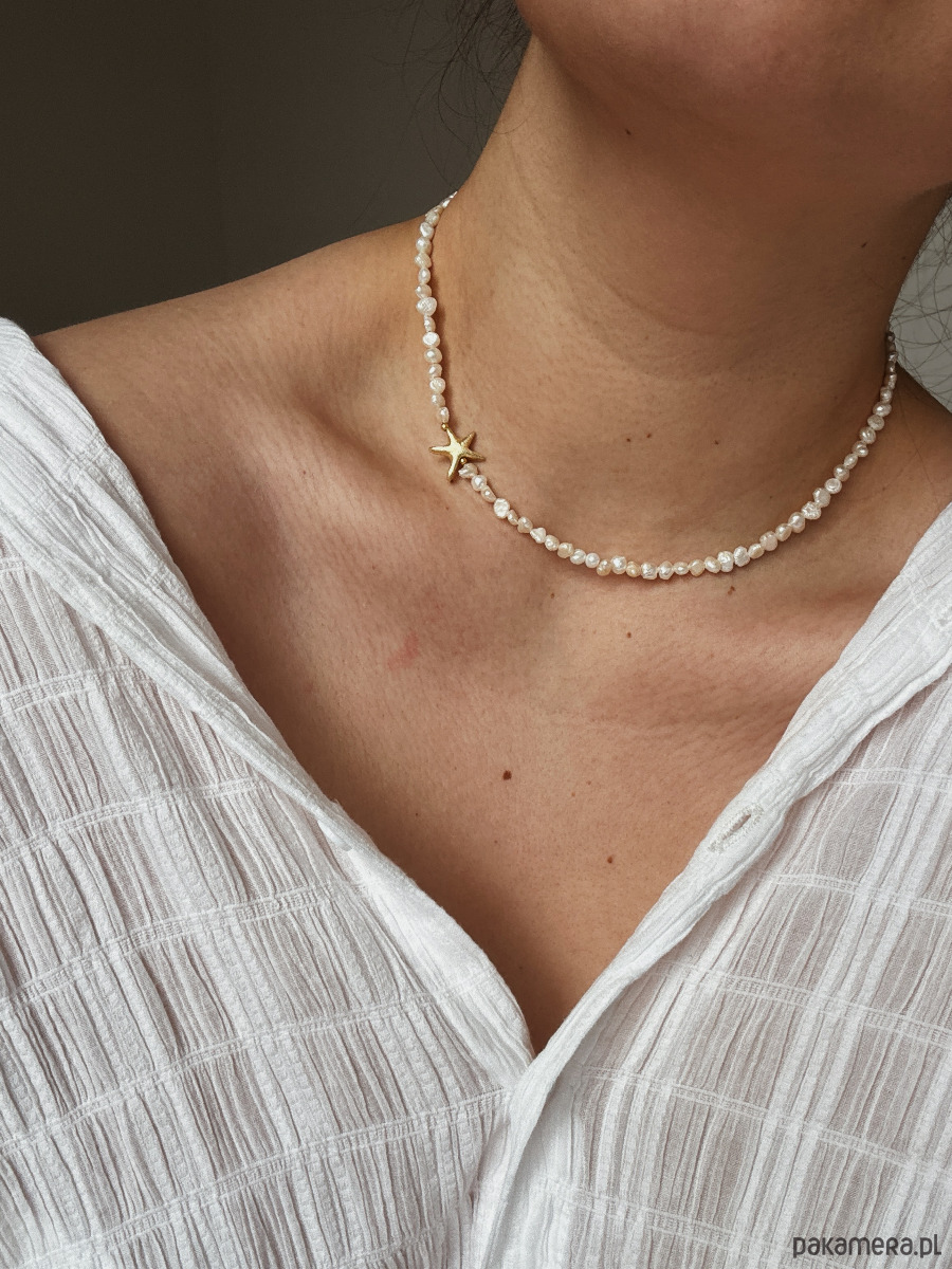 Naszyjnik wykonany na lince jubilerskiej z użyciem pereł naturalnych ,zawieszka jest wykonana ze srebra pr 925 pozłacana 24k złotem, łańcuszek i zapięcie ze stali ch.