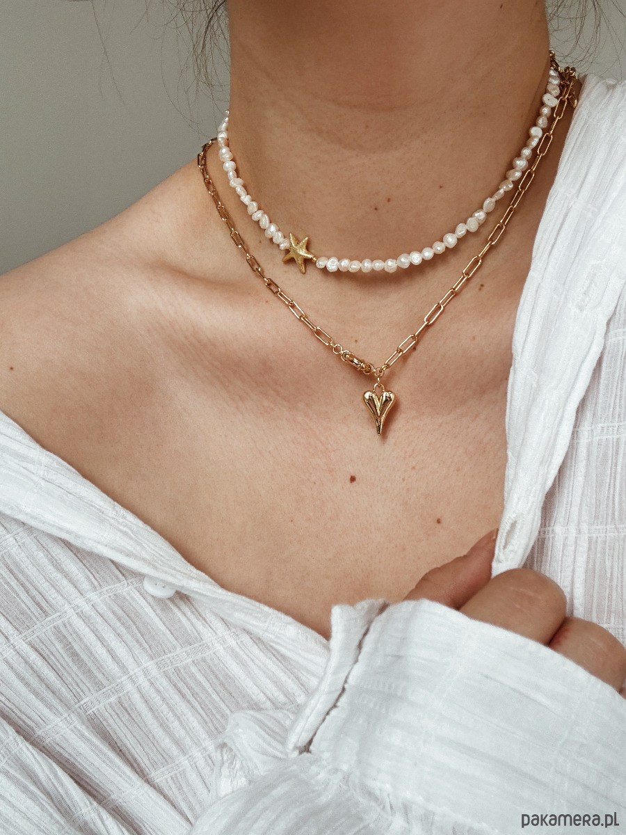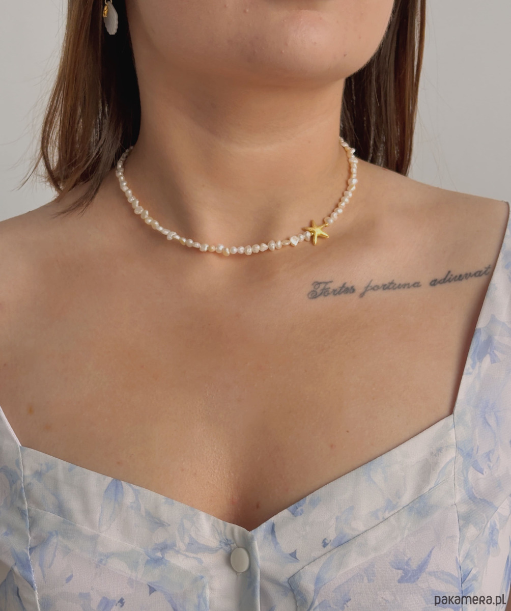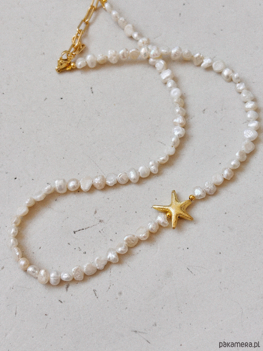 Naszyjnik wykonany na lince jubilerskiej z użyciem pereł naturalnych ,zawieszka jest wykonana ze srebra pr 925 pozłacana 24k złotem, łańcuszek i zapięcie ze stali ch.