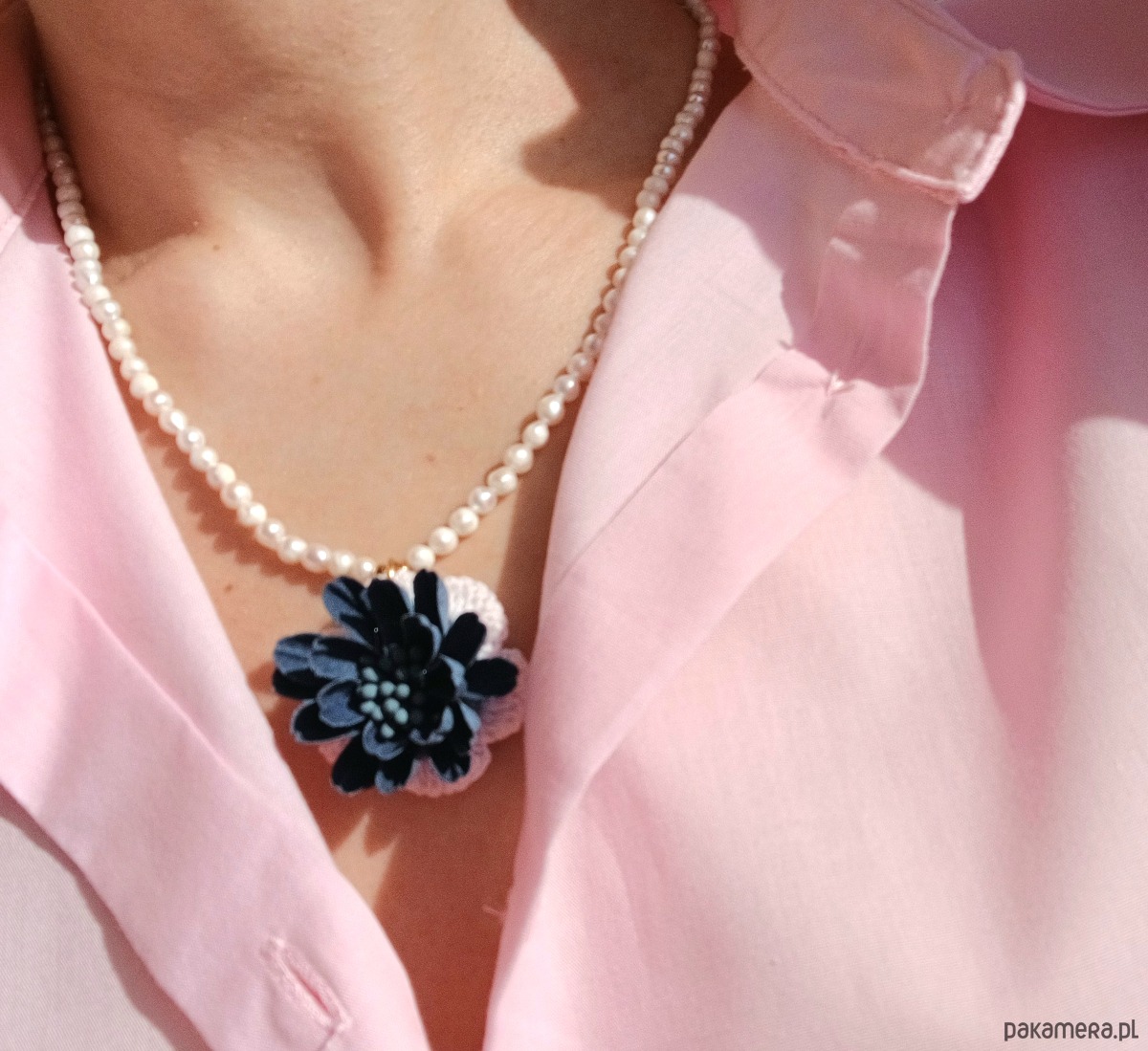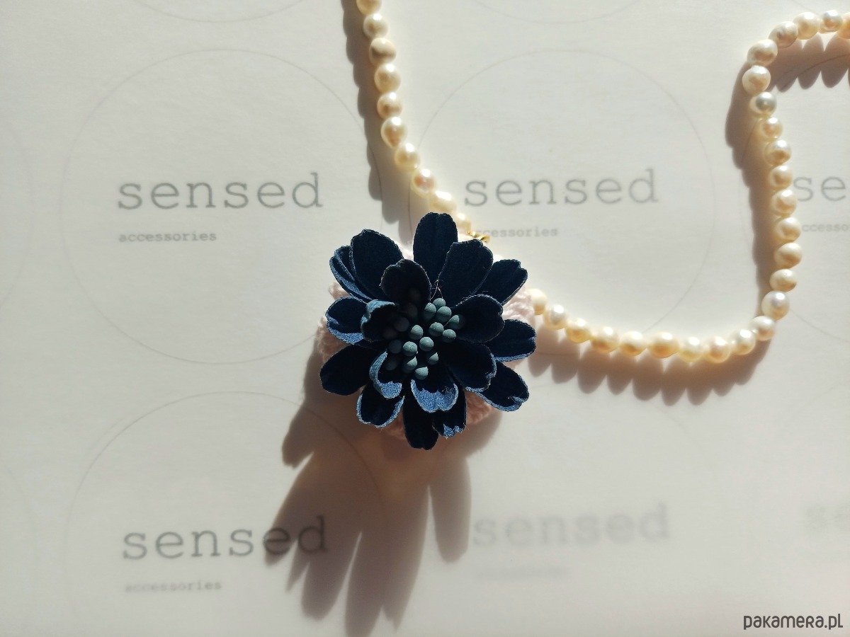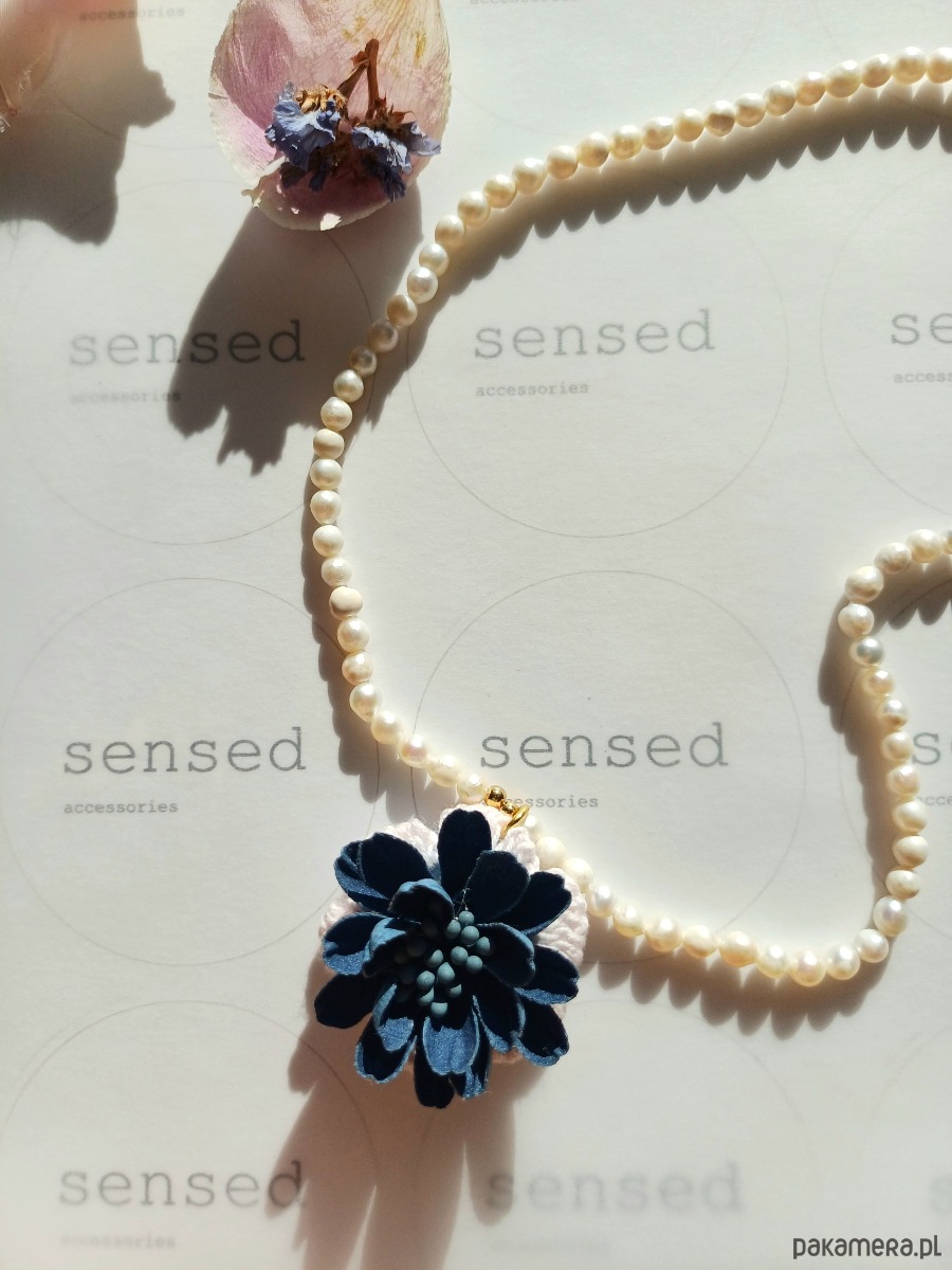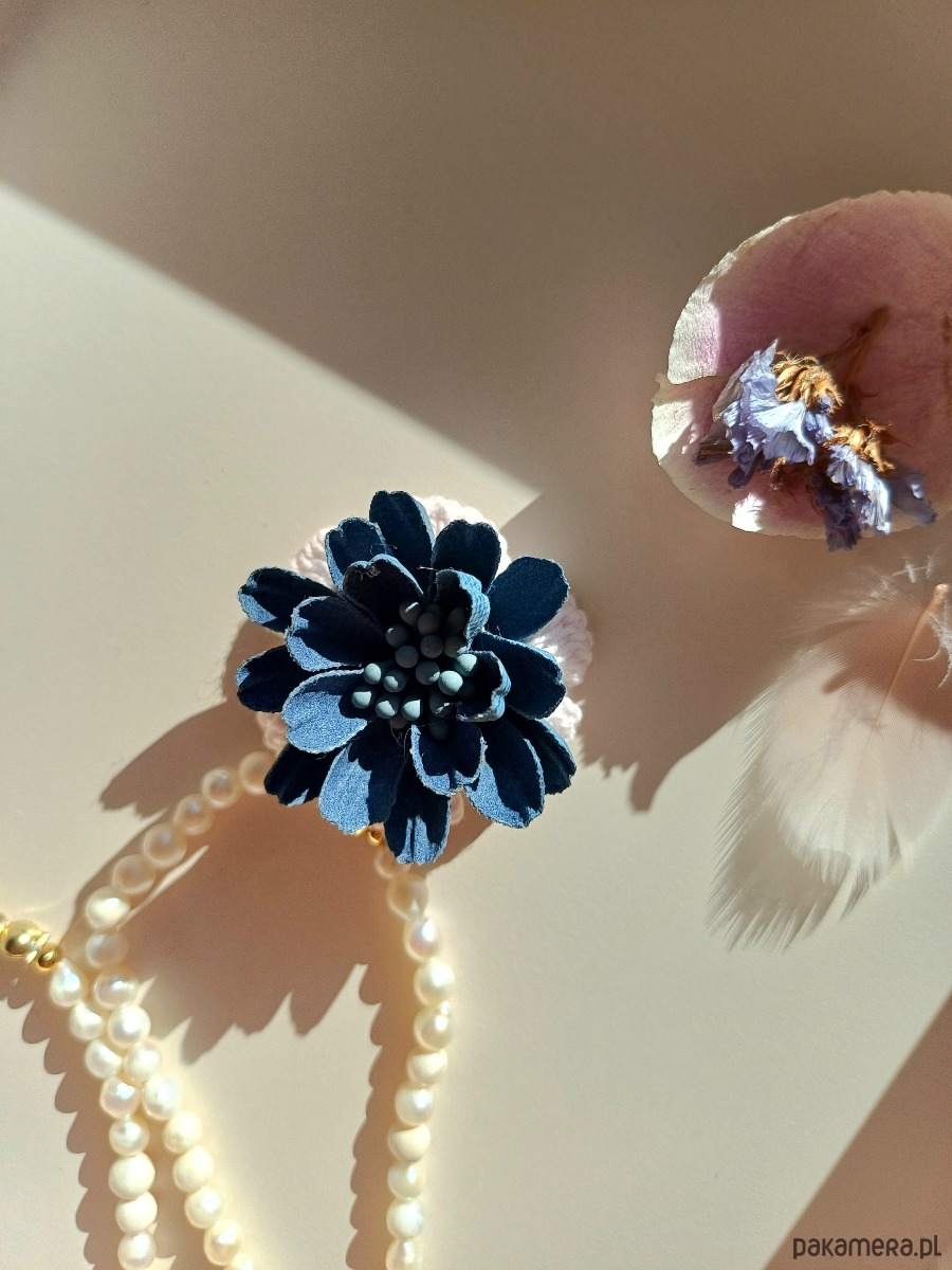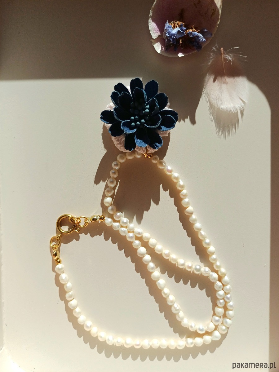 Przeuroczy naszyjnik z pereł naturalnych słodkowodnych z aplikacją - kwiatem wykonanym z bawełny. Kompozycja stanowi wyrafinowaną całość. Pięknie podkreśla proste, eleganckie stylizacje.