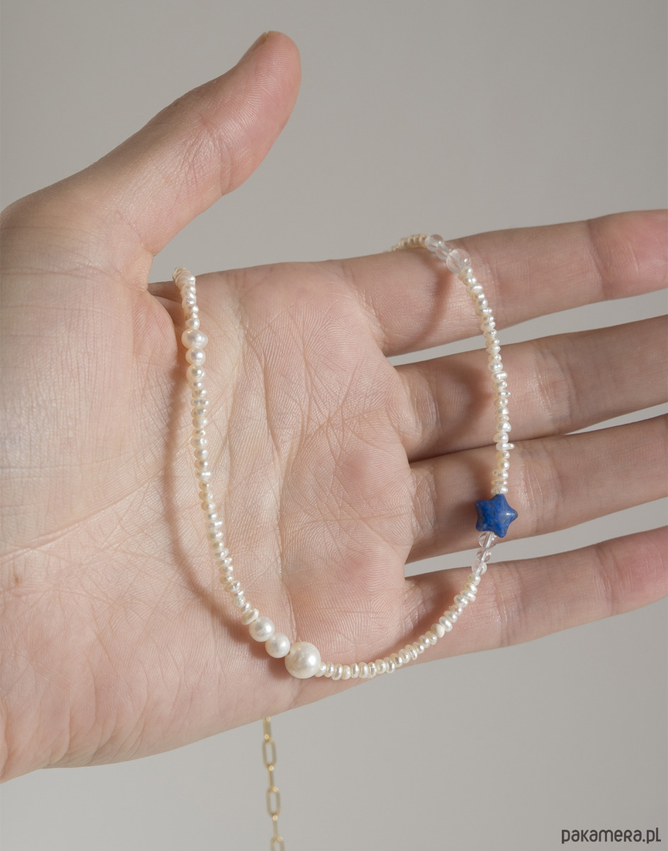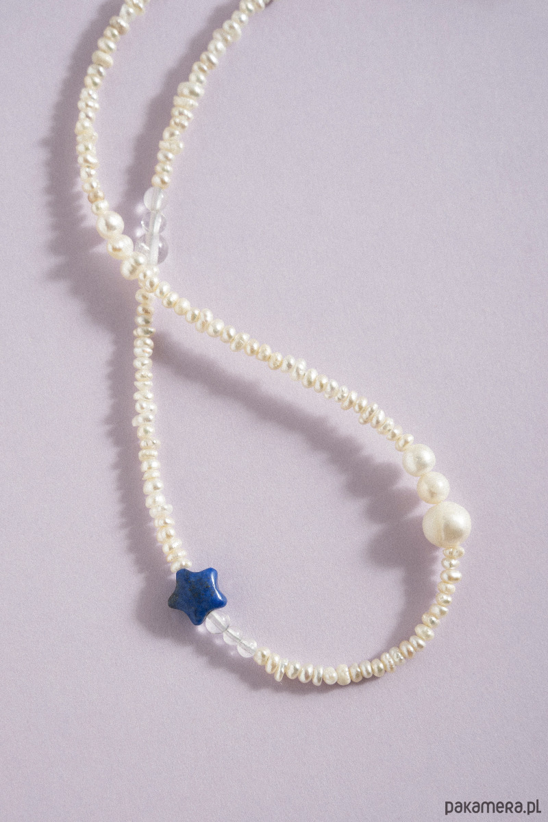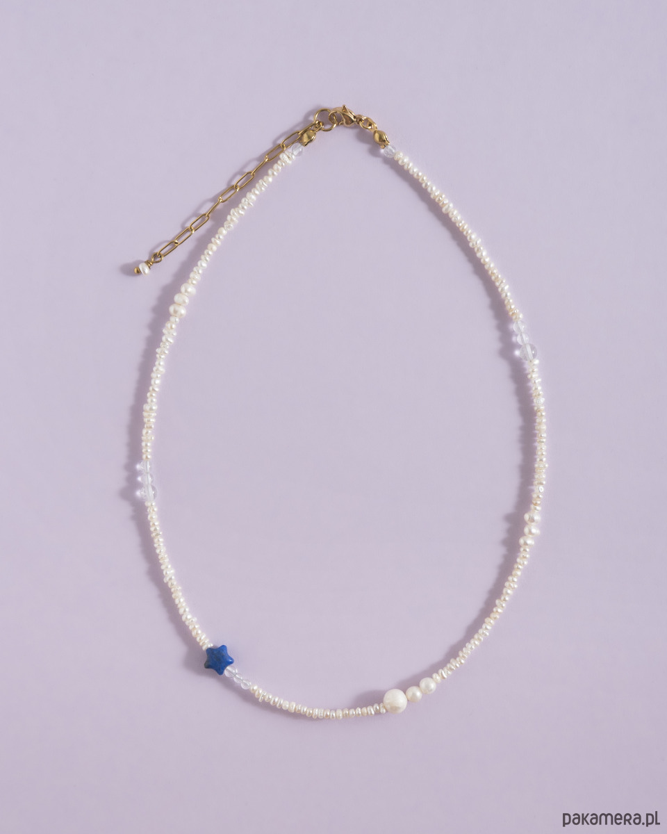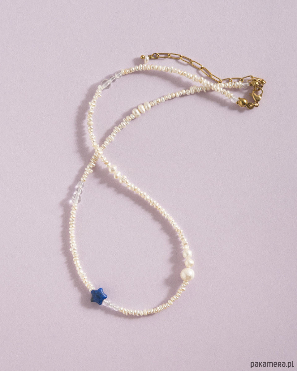 Ręcznie wykonany naszyjnik z naturalnych pereł o różnych wielkościach, kryształu górskiego oraz lapisu lazuli w kształcie gwiazdki.
