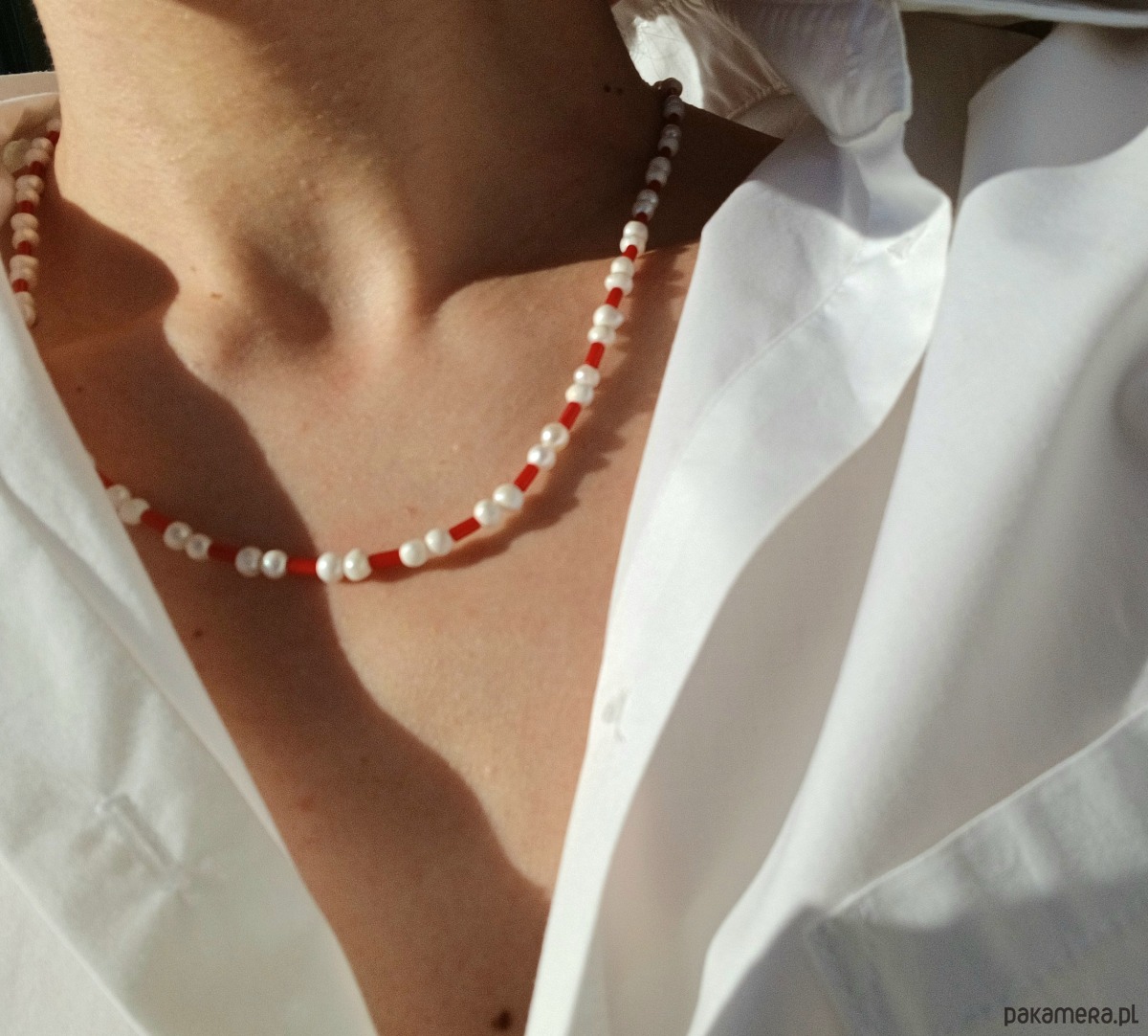Urokliwy design. Klasyka w nietypowym wydaniu. Koral czerwony pięknie eksponuje delikatny połysk pereł.