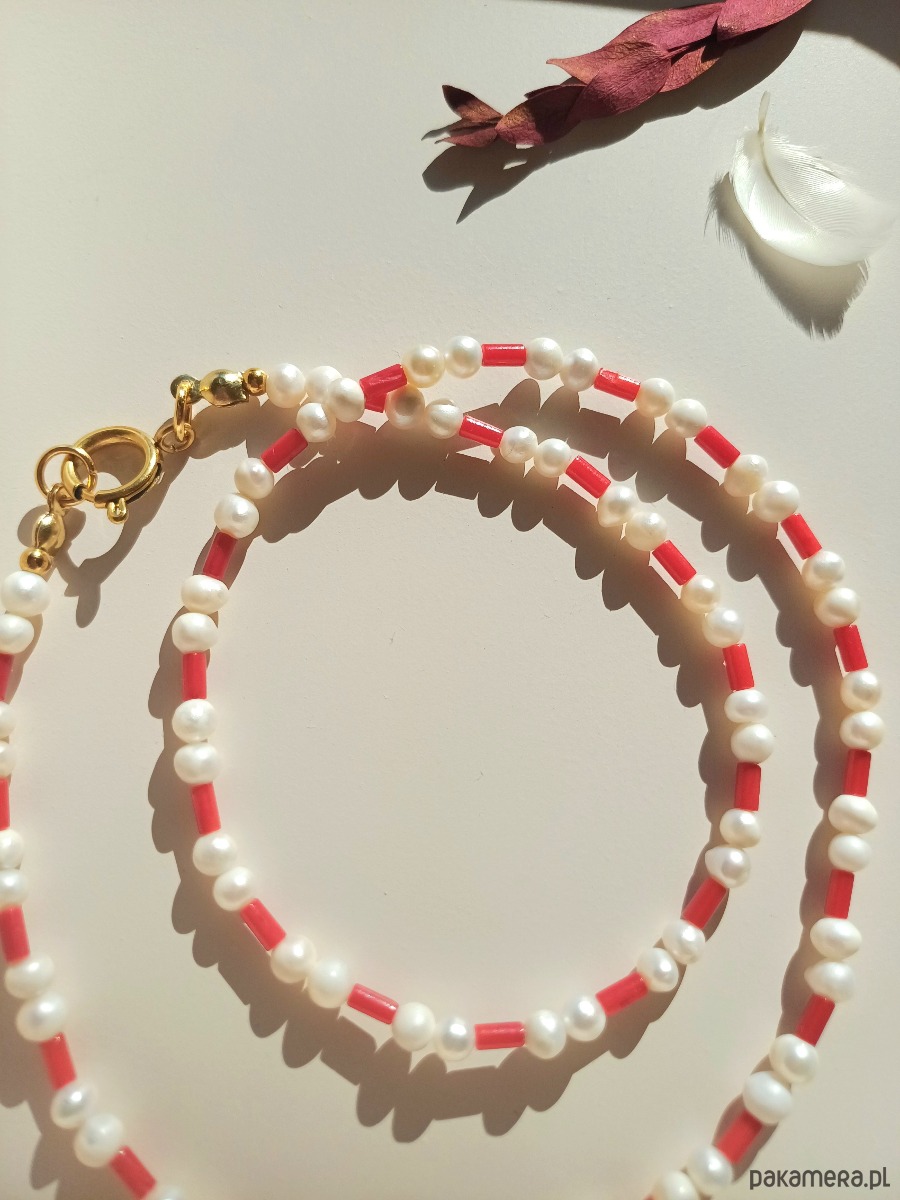 Elementy : perły naturalne słodkowodne : 6 - 7 mm, koral czerwony : 5mm, wygodne zapięcie typu federing : stal szlachetna .
