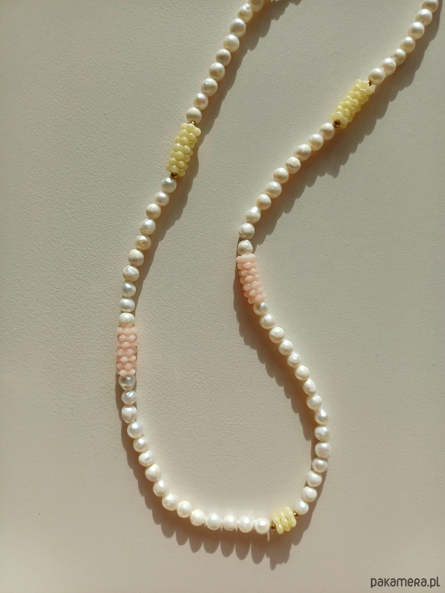Przeuroczy naszyjnik o delikatnej formie. Perły naturalne w połączeniu ze szklanymi koralikami o pastelowych barwach, dodają całości lekkości. Można stylizować na wiele sposobów.
