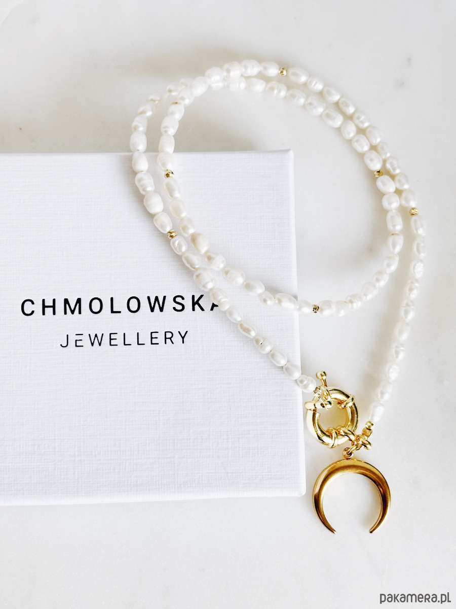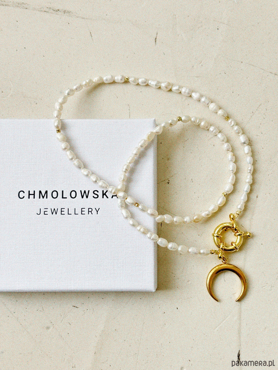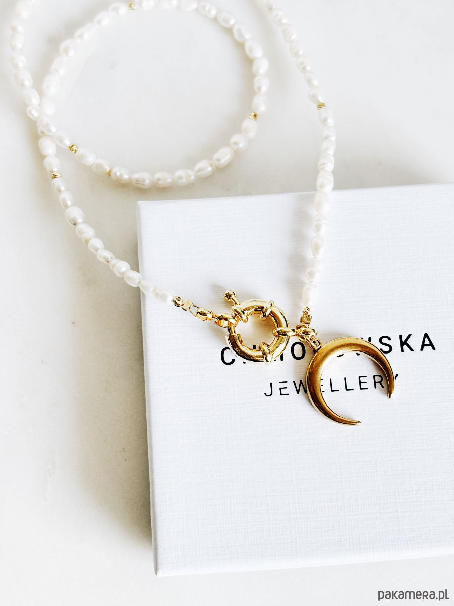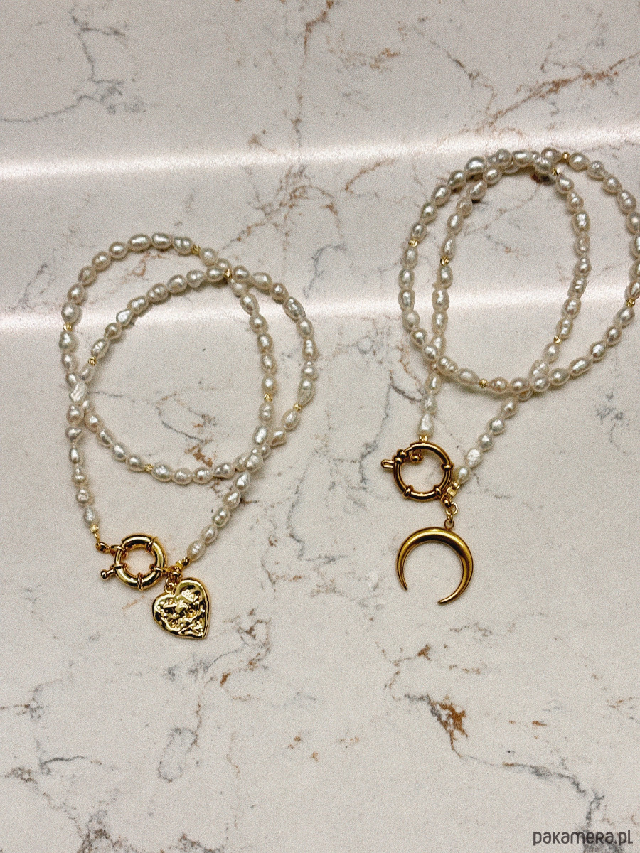 Naszyjnik wykonany na lince jubilerskiej z użyciem pereł naturalnych słodkowodnych, zapięcie i zawieszka są rodowane złotem.
