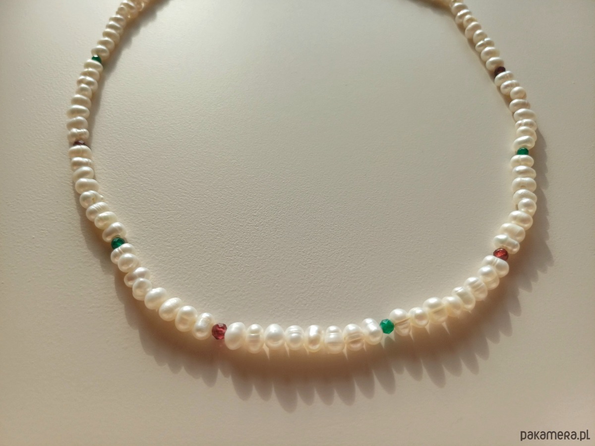 Niezwykle urokliwy naszyjnik z pereł naturalnych, w delikatnym towarzystwie zielonego onyksu i granatu.Pięknie wpasowuje się w eleganckie stylizacje, za sprawą onyksu i granatu naszyjnik nabiera wyrazistości, przykuwa uwagę.