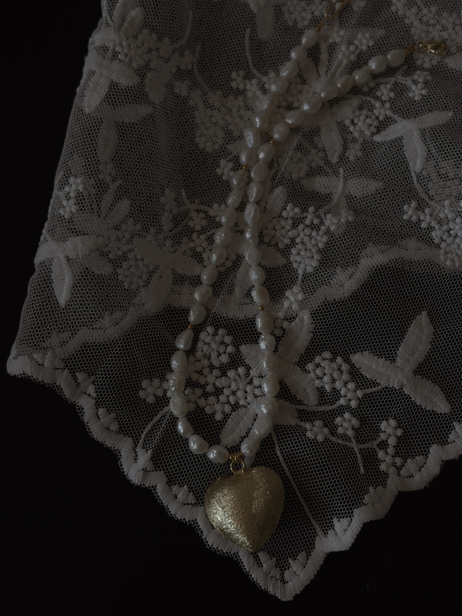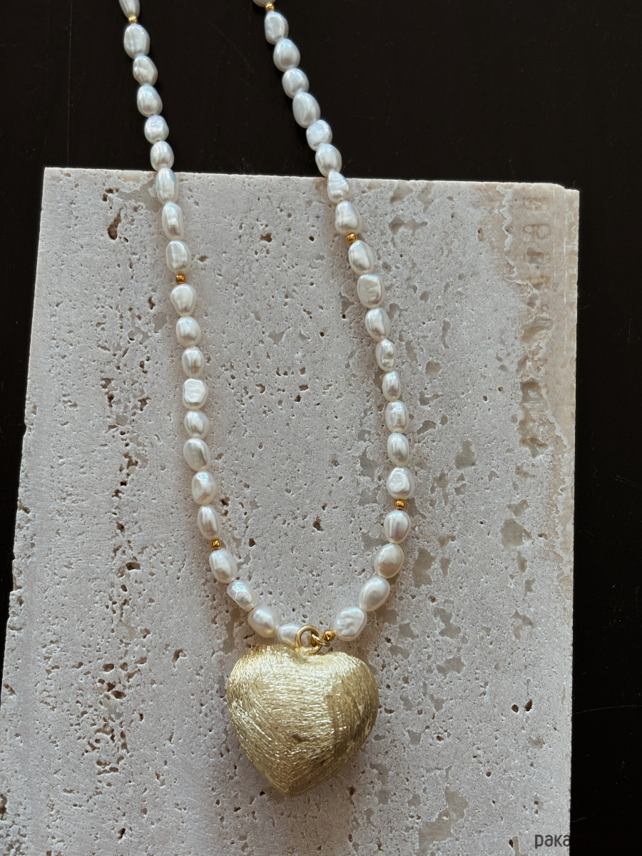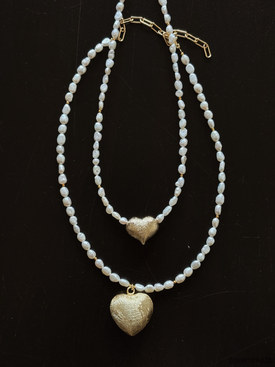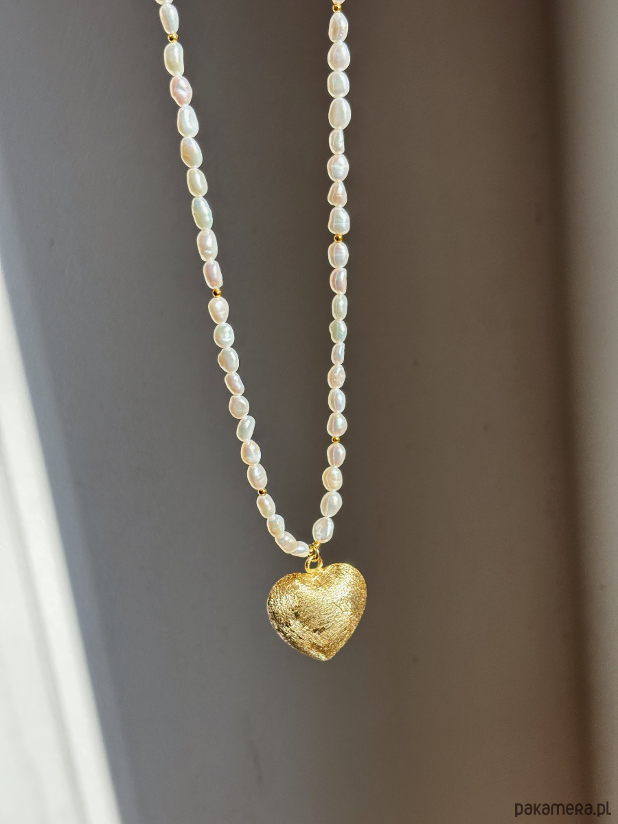 Naszyjnik wykonany jest na lince jubilerskiej z użyciem pereł naturalnych, przedłużany łańcuszkiem z dużą zawieszką z sercem ( jest lekkie).