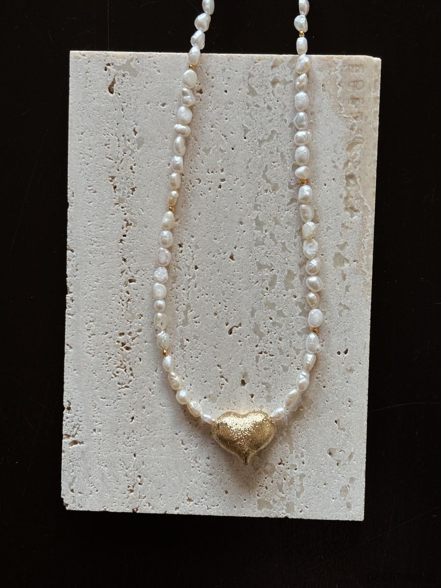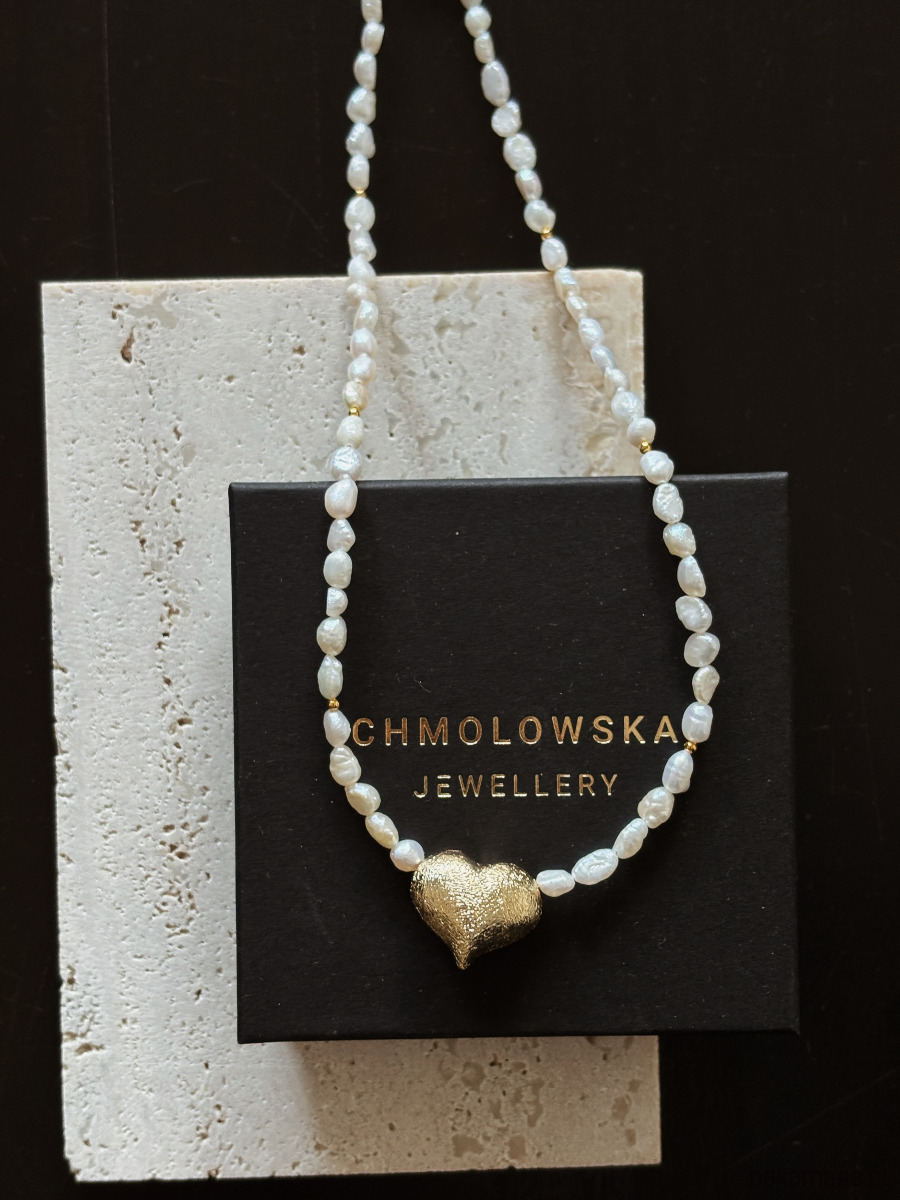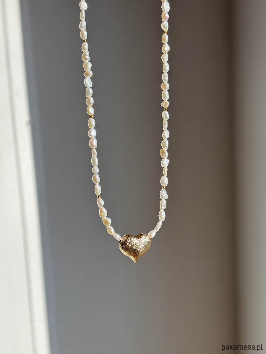 Naszyjnik wykonany jest na lince jubilerskiej z użyciem pereł naturalnych, przedłużany łańcuszkiem z zawieszką z sercem ( jest lekkie).