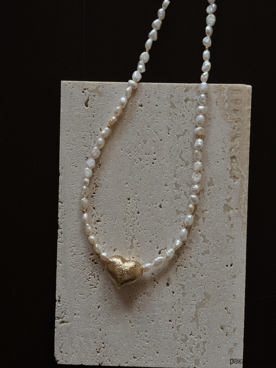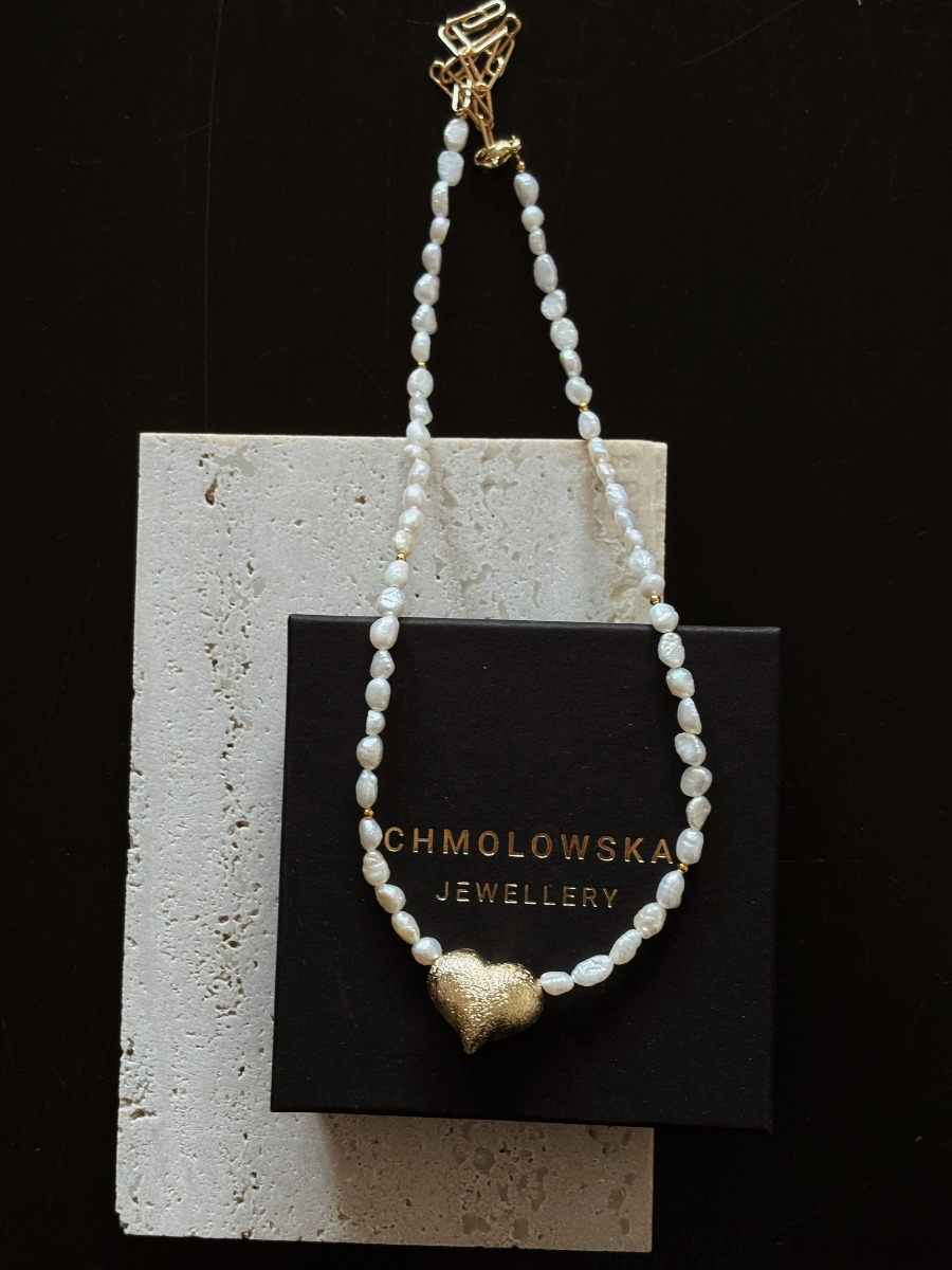 Naszyjnik wykonany jest na lince jubilerskiej z użyciem pereł naturalnych, przedłużany łańcuszkiem z zawieszką z sercem ( jest lekkie).