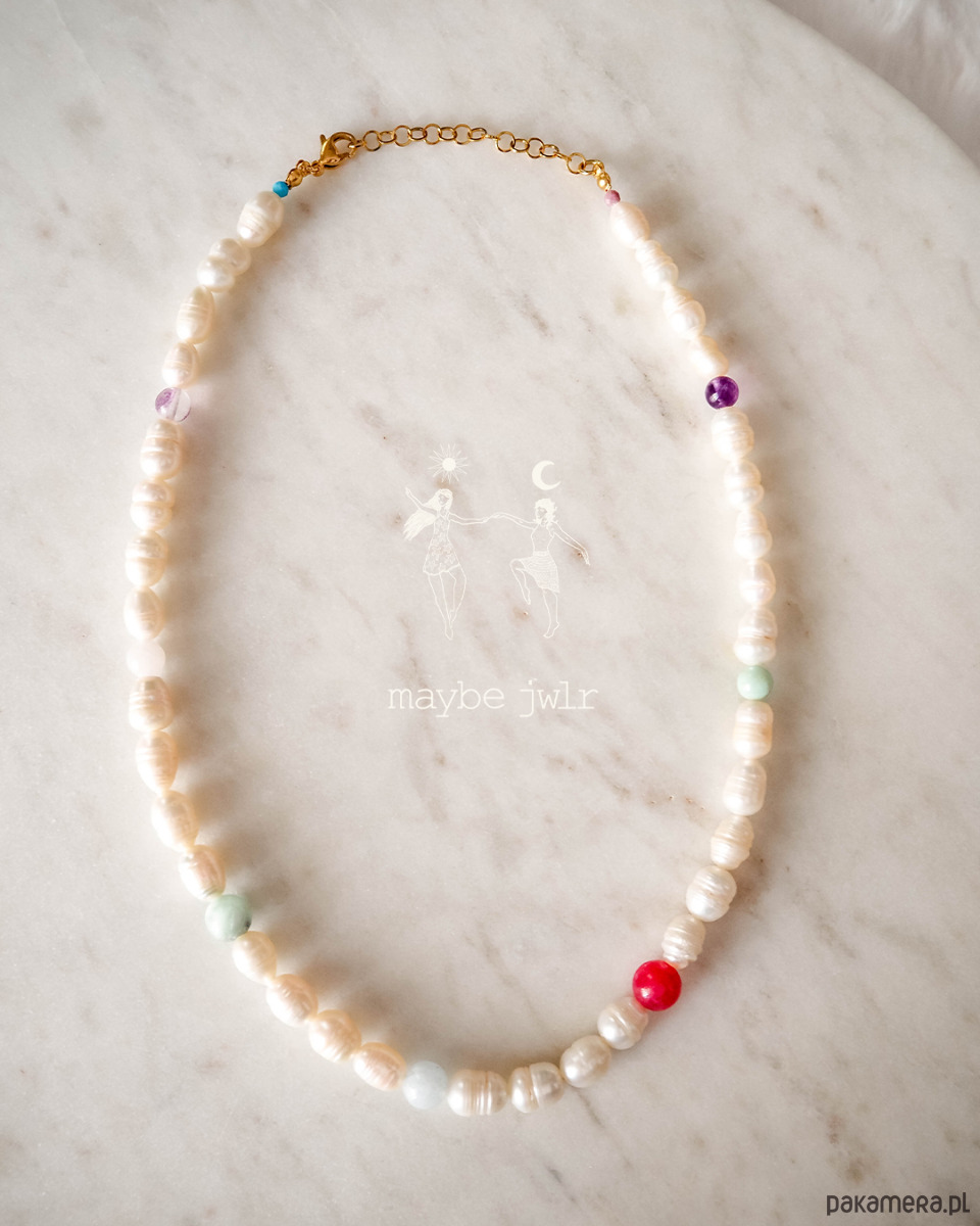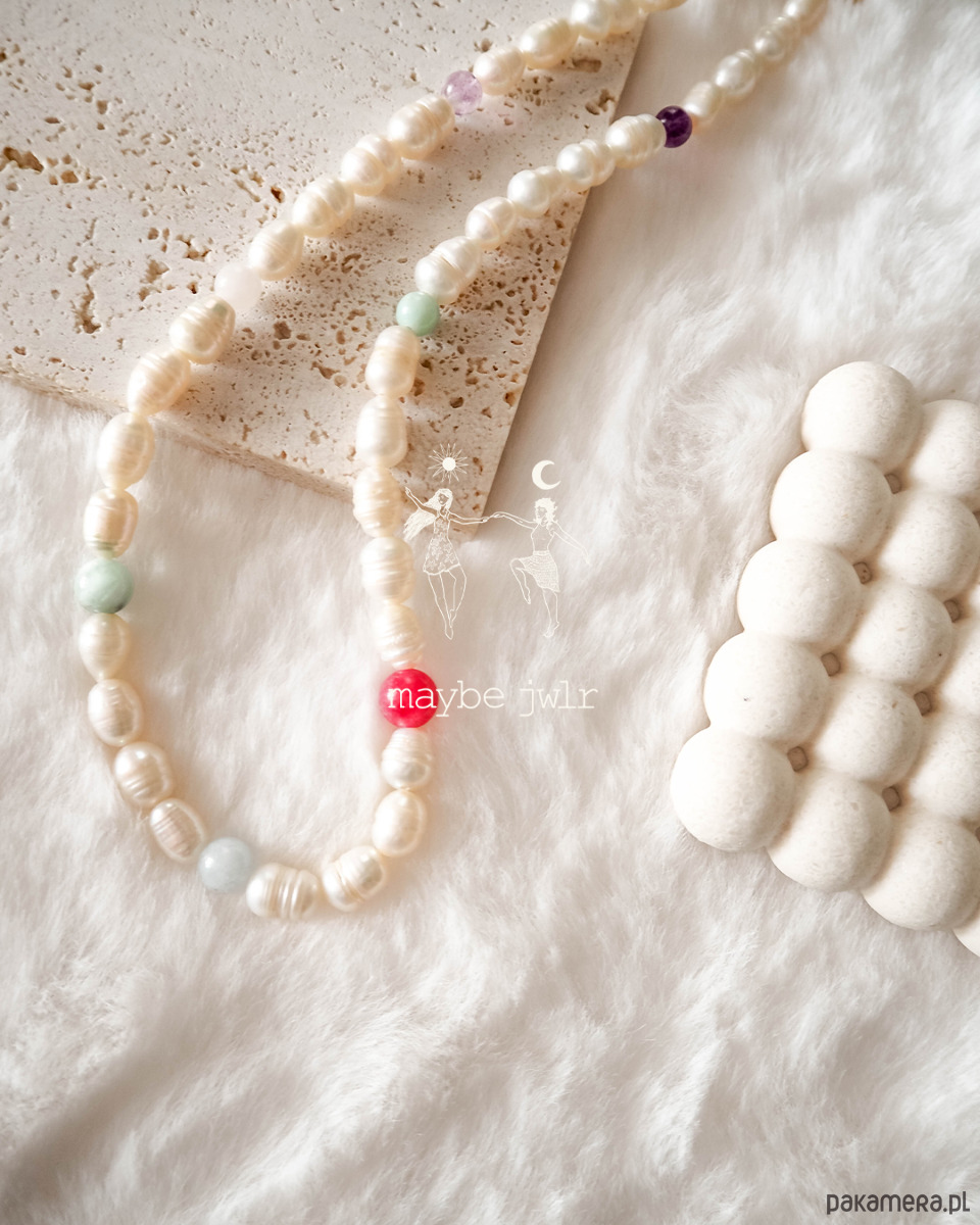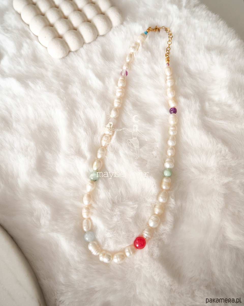 Kobiecy i wyrazisty naszyjnik z pereł naturalnych słodkowodnych o wielkości 6-7mm, przeplatany kolorowymi kamieniami takimi jak jadeit, ametyst i amazonit.