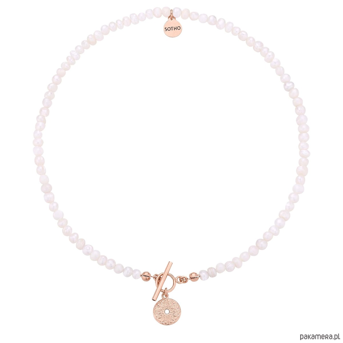 Złoty naszyjnik wykonany z naturalnych pereł słodkowodnych, zdobiony zapięciem i medalionem oraz logo marki. Wszystkie elementy wykonane ze srebra 925 powlekanego 18 karatowym różowym złotem. Perły są nieregularne, unikatowe, delikatnie różnią się od siebie i mogą różnić się od tych na zdjęciu.