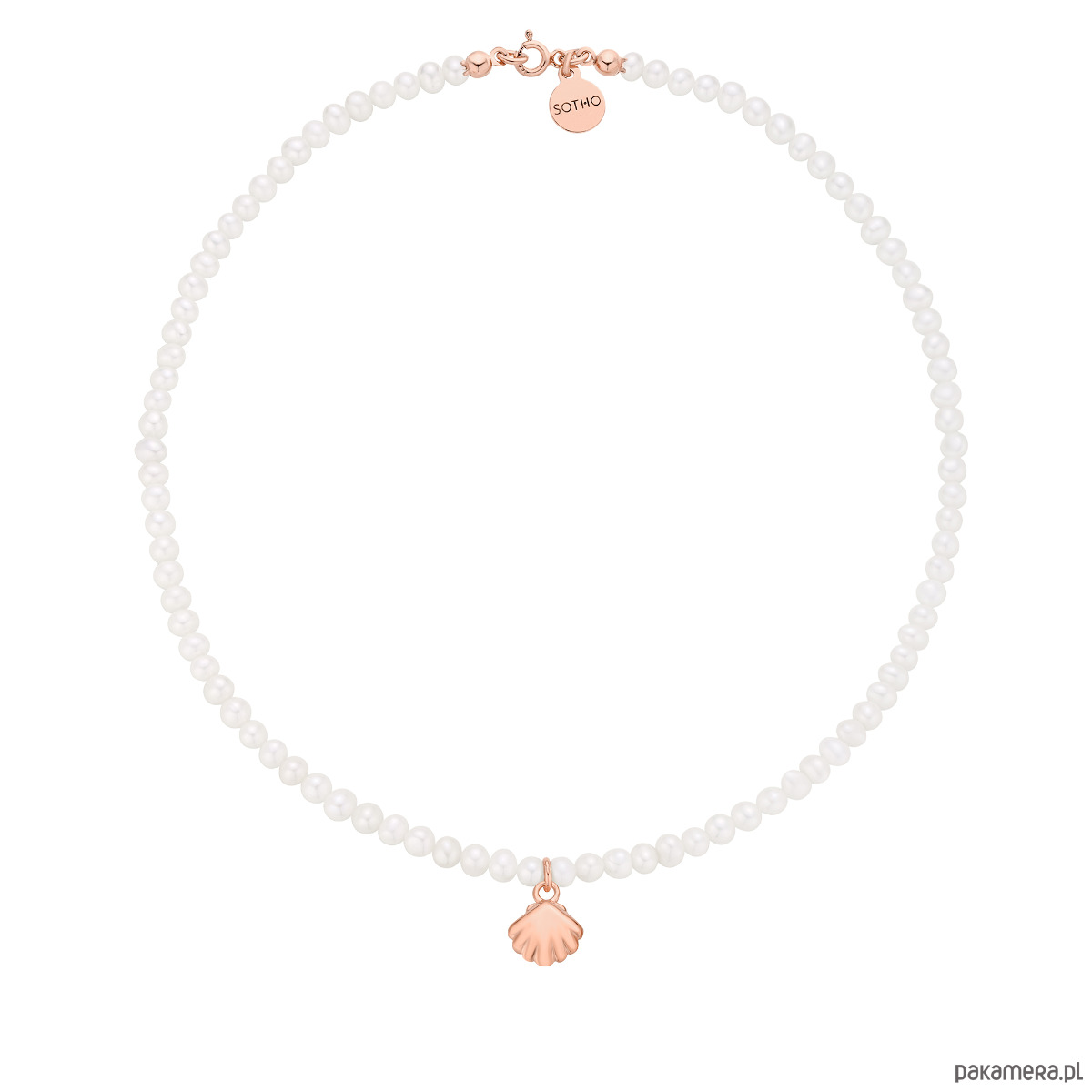 Naszyjnik wykonany z naturalnych pereł słodkowodnych z muszelką i zawieszką z logo marki. Wszystkie elementy wykonane ze srebra 925 powlekanego 18 karatowym różowym złotem.
