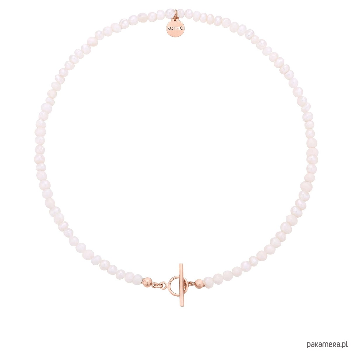 Naszyjnik wykonany z naturalnych pereł słodkowodnych, zdobiony zapięciem i logo marki. Wszystkie elementy wykonane ze srebra 925 powlekanego 18 karatowym różowym złotem. Perły są nieregularne, unikatowe, delikatnie różnią się od siebie i mogą różnić się od tych na zdjęciu.