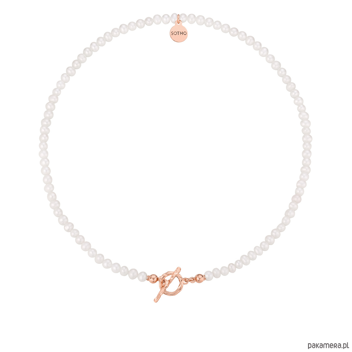 Naszyjnik wykonany z naturalnych pereł słodkowodnych, z ozdobnym zapięciem i zawieszką z logo marki. Wszystkie elementy wykonane ze srebra 925 powlekanego 18 karatowym różowym złotem.