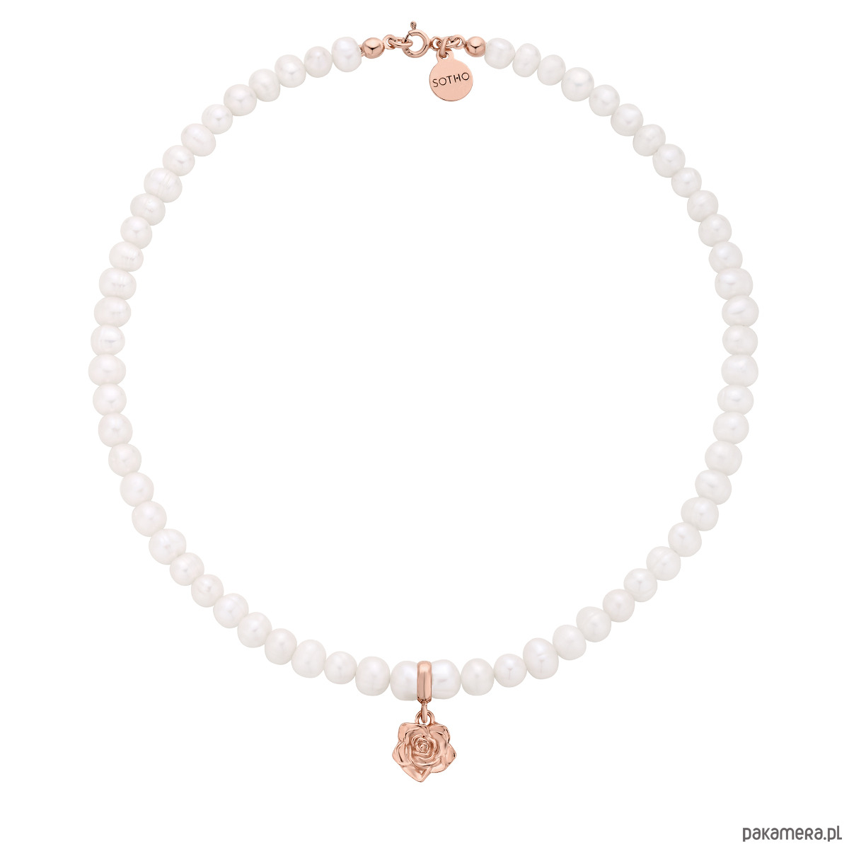 Złoty naszyjnik wykonany z naturalnych pereł słodkowodnych z różą i zawieszką z logo marki. Wszystkie elementy wykonane ze srebra 925 powlekanego 24 karatowym różowym złotem.