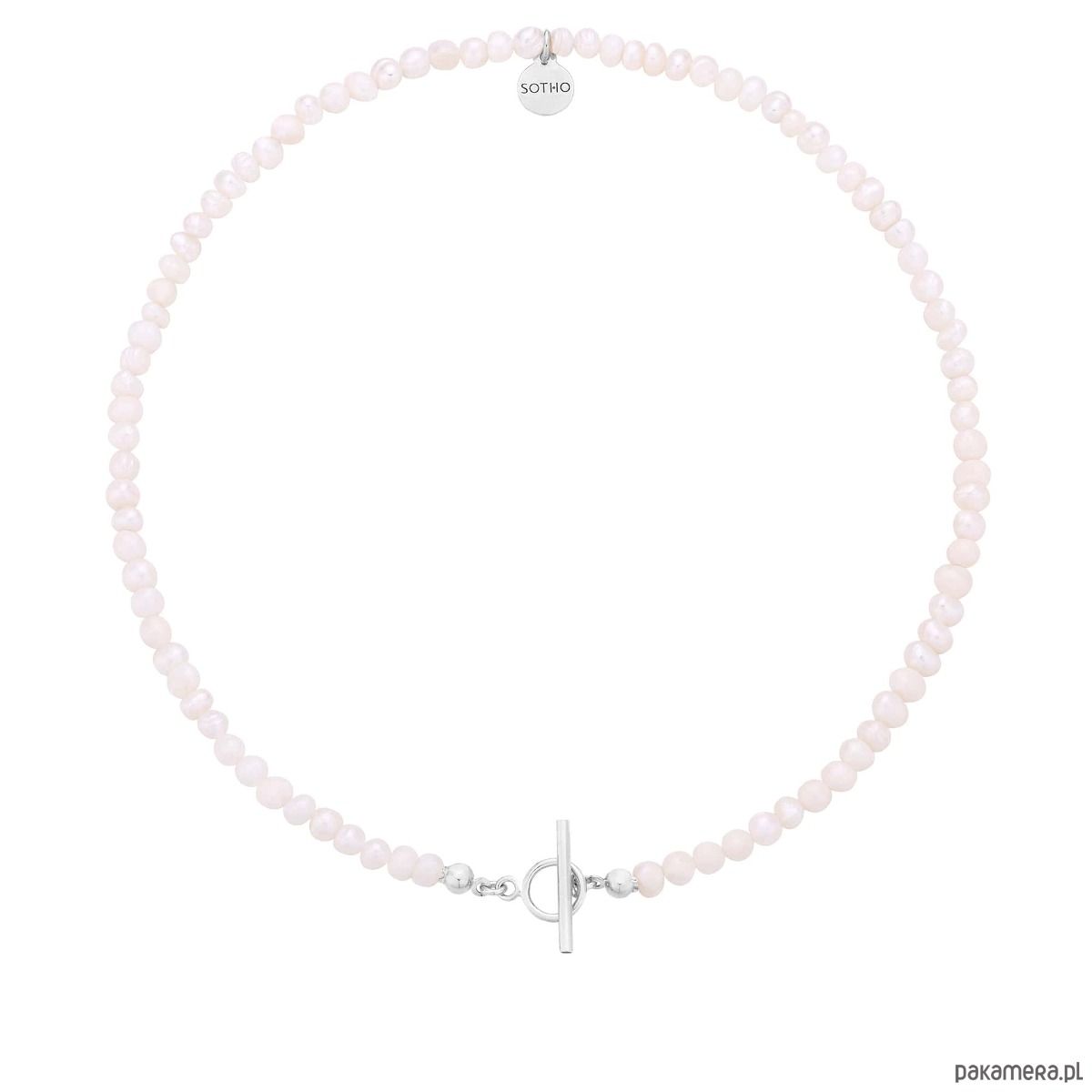 Naszyjnik wykonany z naturalnych pereł słodkowodnych, zdobiony zapięciem i logo marki. Wszystkie elementy wykonane ze srebra 925. Perły są nieregularne, unikatowe, delikatnie różnią się od siebie i mogą różnić się od tych na zdjęciu.