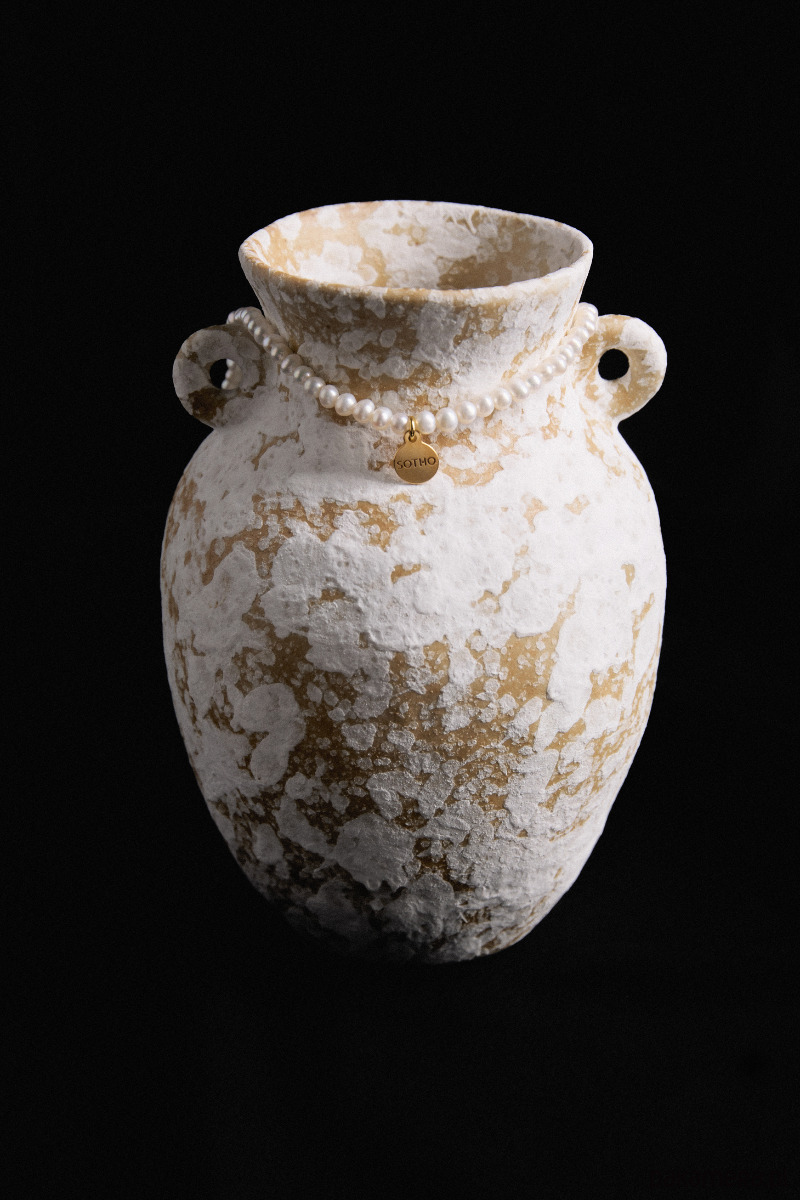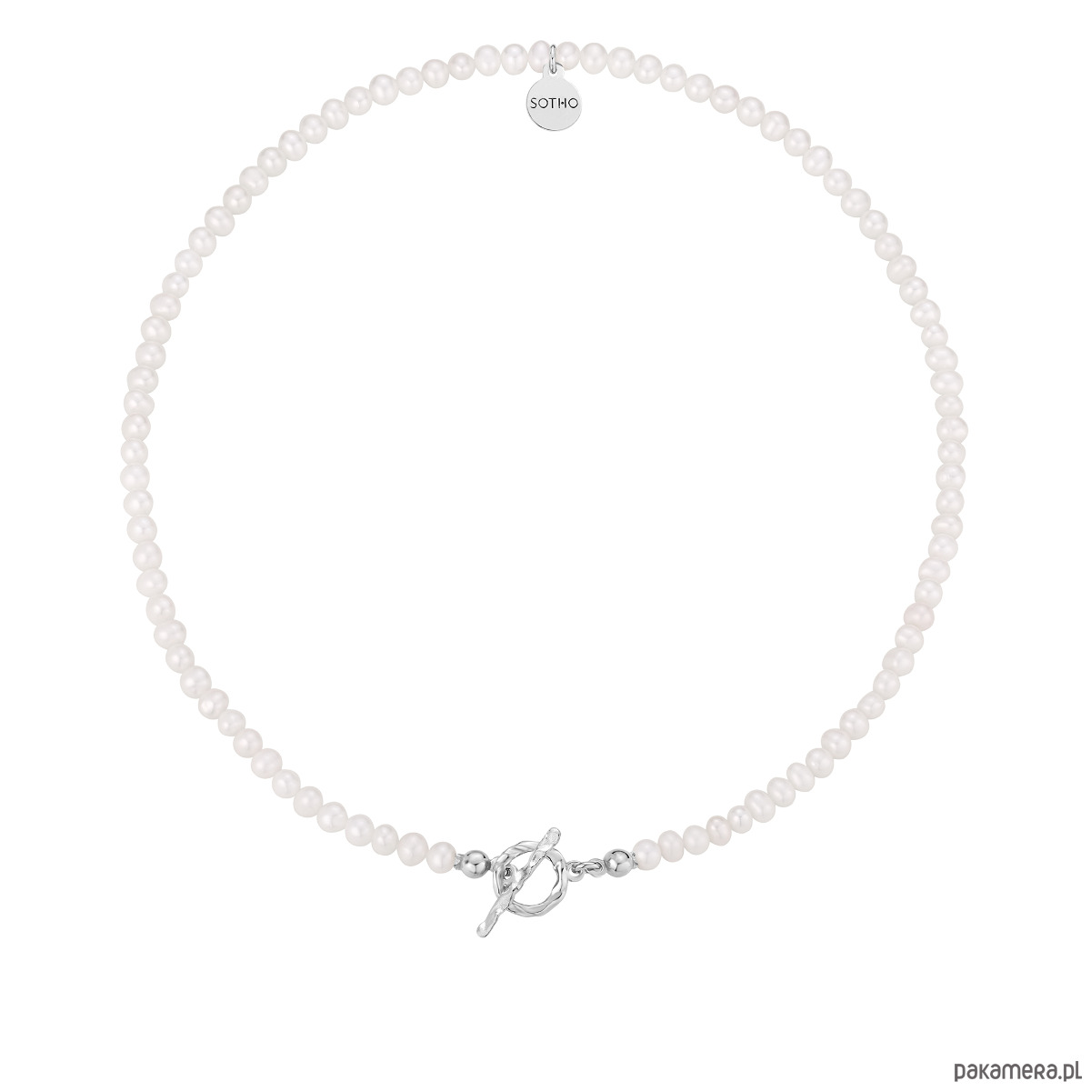 Srebrny naszyjnik wykonany z naturalnych pereł słodkowodnych, zdobiony zapięciem i zawieszką z logo marki. Wszystkie elementy wykonane ze srebra 925.