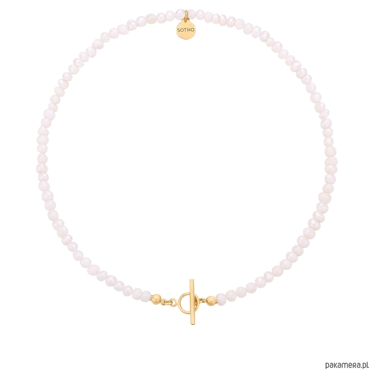 Naszyjnik wykonany z naturalnych pereł słodkowodnych, zdobiony zapięciem i logo marki. Wszystkie elementy wykonane ze srebra 925 powlekanego 24 karatowym żółtym złotem. Perły są nieregularne, unikatowe, delikatnie różnią się od siebie i mogą różnić się od tych na zdjęciu.