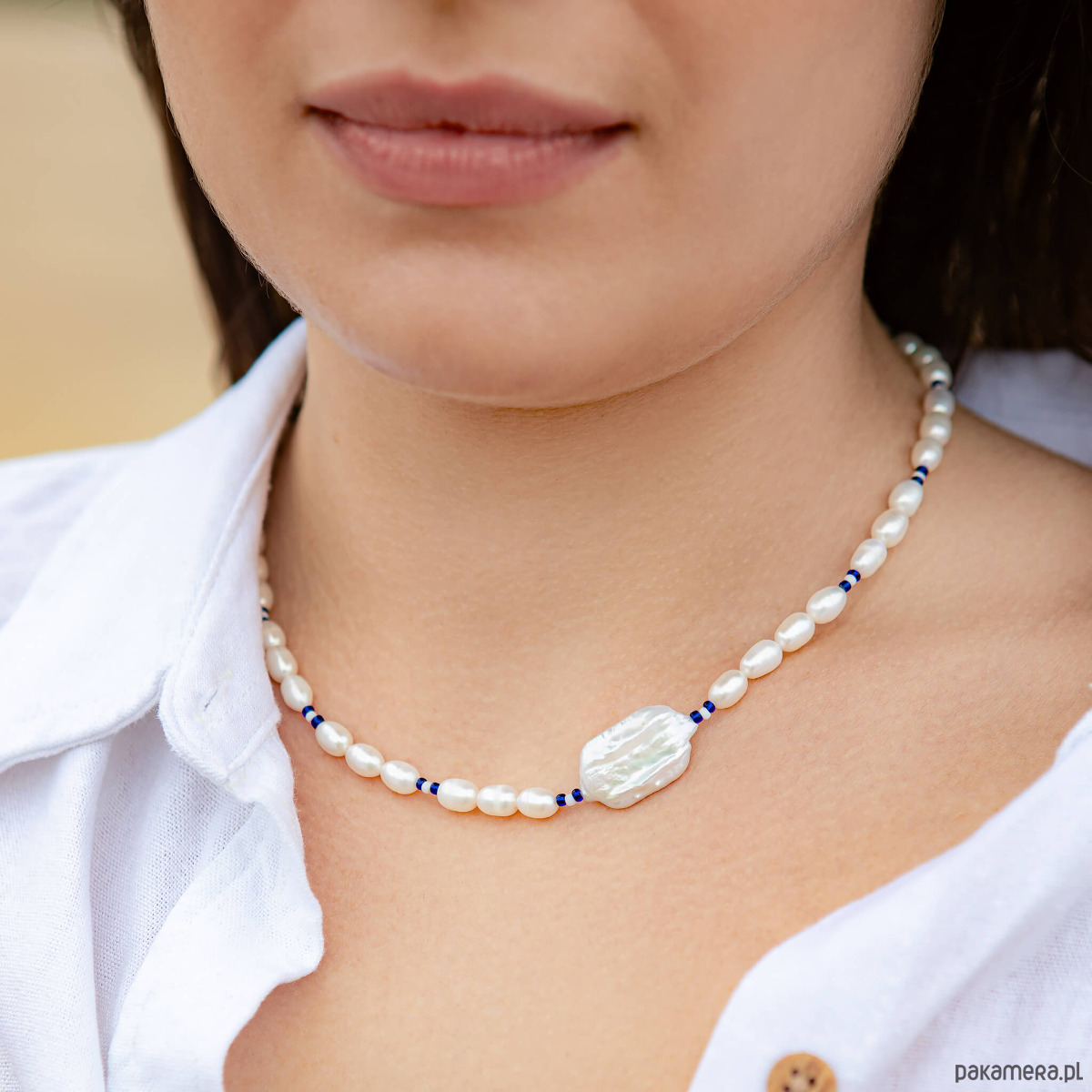 Naszyjnik z naturalnych pereł z dodatkiem szklanych koralików i przekładki z dużej, naturalnej perły w kształcie prostokąta.
