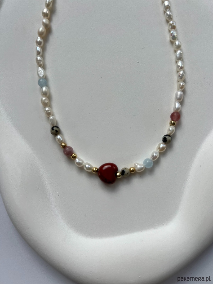 Naszyjnik wykonany z pereł oraz kamieni jaspis, opal, akwamaryn