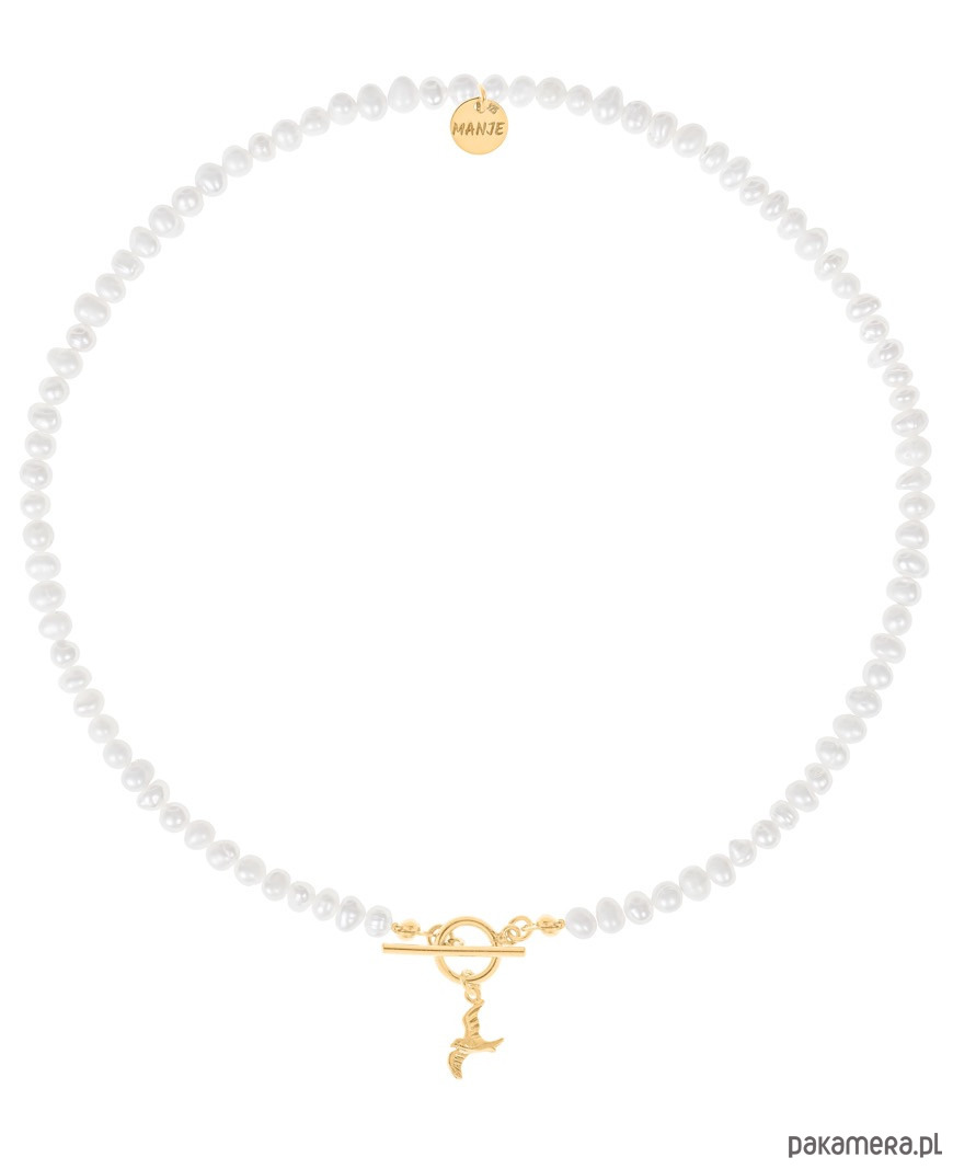 Naszyjnik z naturalnych pereł z pozłacanym ptakiem. Naszyjnik wykonany jest z białych naturalnych pereł hodowlanych. Zawieszka, zapięcie oraz logo wykonane ze srebra próby 925, pokryte 24-karatowym złotem.