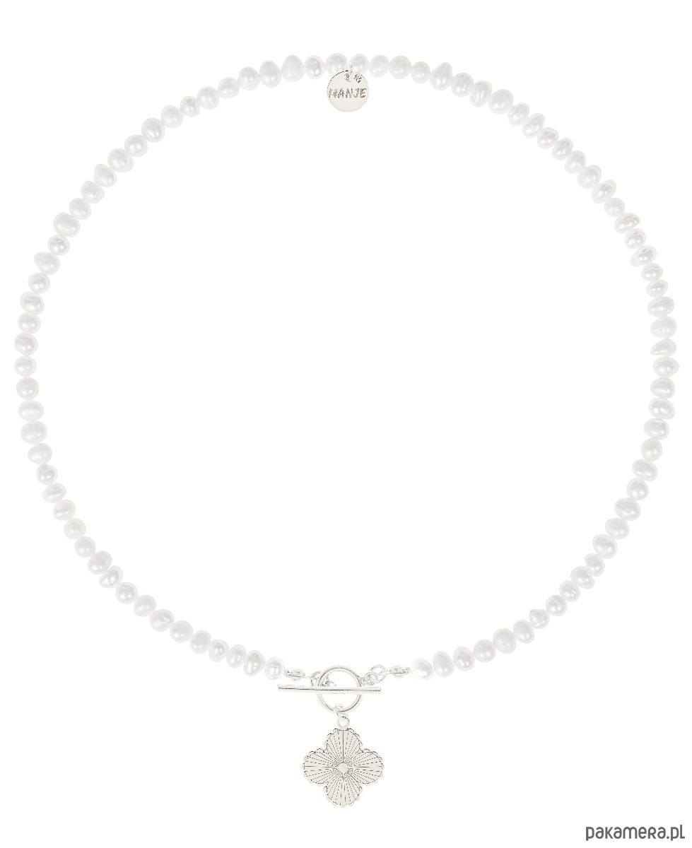 Naszyjnik z naturalnych pereł ze srebrną koniczyną. Naszyjnik wykonany jest z białych naturalnych pereł hodowlanych. Zawieszka, zapięcie oraz logo wykonane ze srebra próby 925.