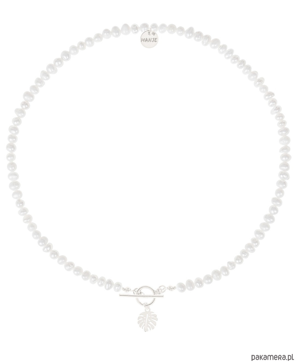 Naszyjnik z naturalnych pereł ze srebrnym małym listkiem Monstery. Naszyjnik wykonany jest z białych naturalnych pereł hodowlanych. Zawieszka, zapięcie oraz logo wykonane ze srebra próby 925.
