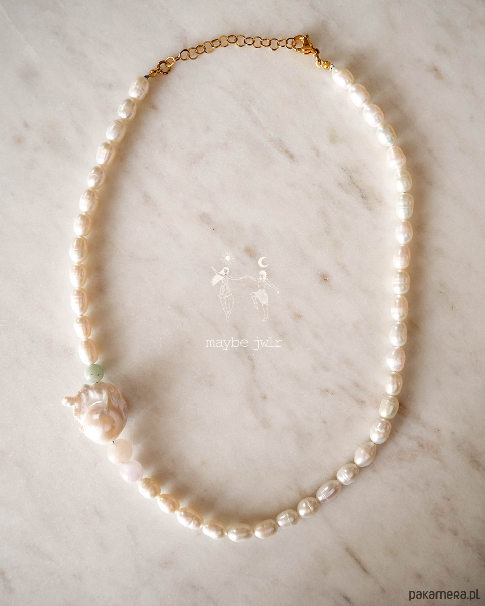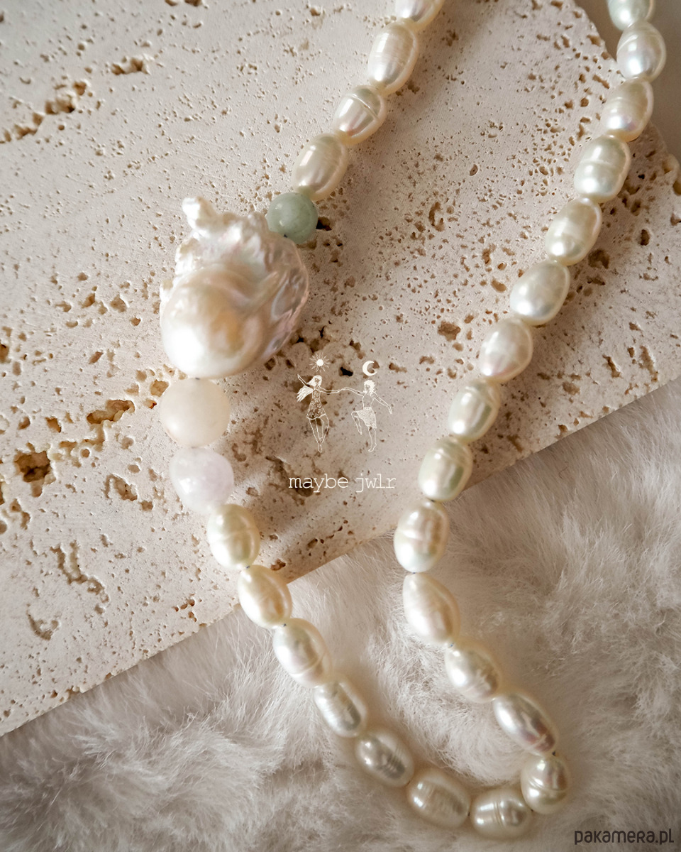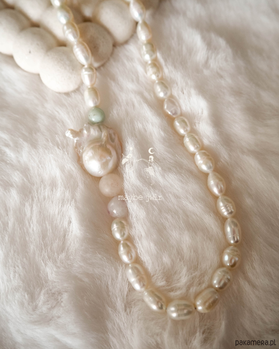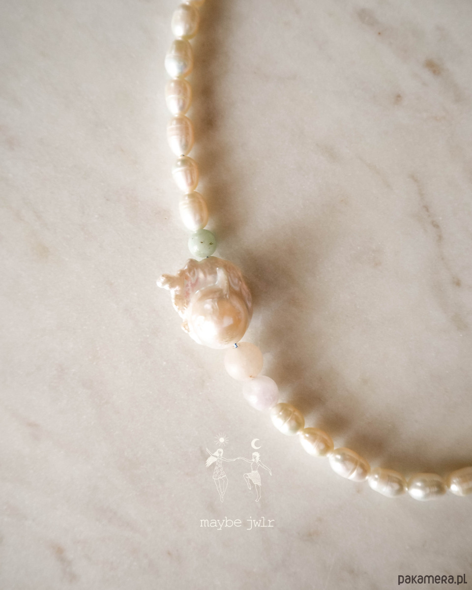 Naszyjnik powstał z dwóch rodzajów pereł naturalnych, klasycznych podłóżnych o wielkości 4-5 mm oraz większej barokowej ok 15-20mm, oddzielone są od siebie kolorowymi kamieniami awenturynu oraz amazonitu.