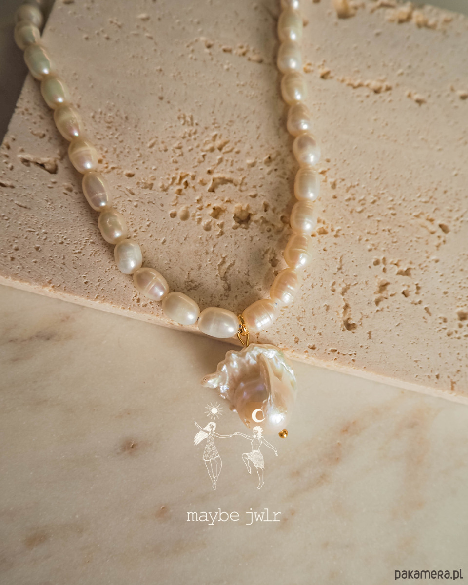 Naszyjnik powstał z dwóch rodzajów pereł naturalnych, klasycznych podłużnych o wielkości 4-5 mm oraz większej barokowej ok 15-20mm która jest w postaci zawieszki.