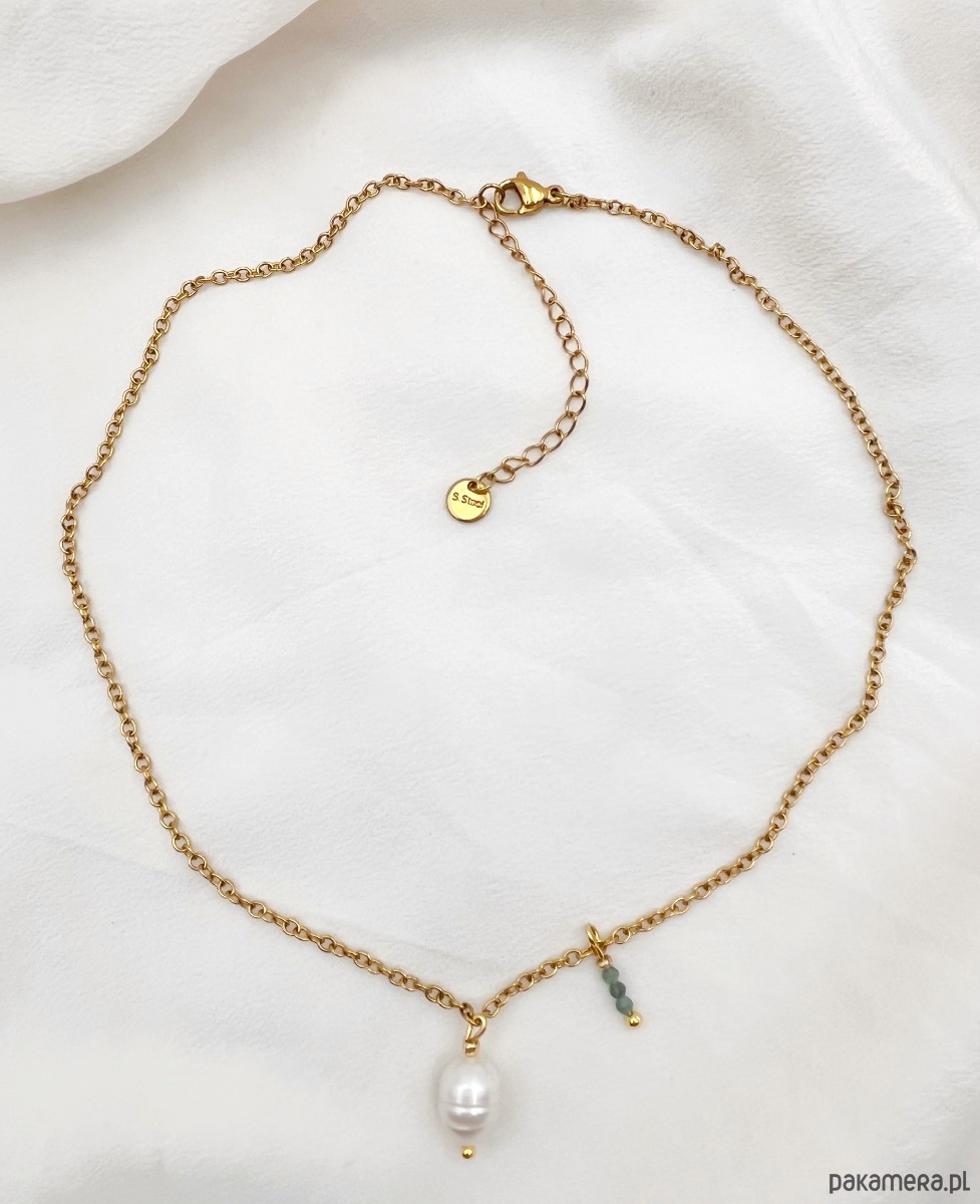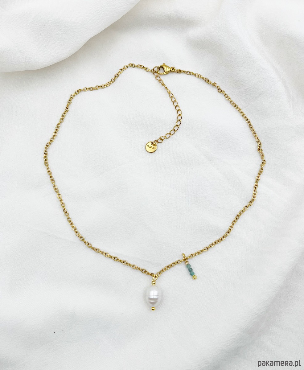 Naszyjnik pięknie prezentuje się zarówno solo, jak i w duecie z innymi łańcuszkami. Akwamaryn dodaje mu oryginalności, a perła – ponadczasowej klasy. Noś go do lnianej sukienki, jedwabnej koszuli lub… bikini na plaży.