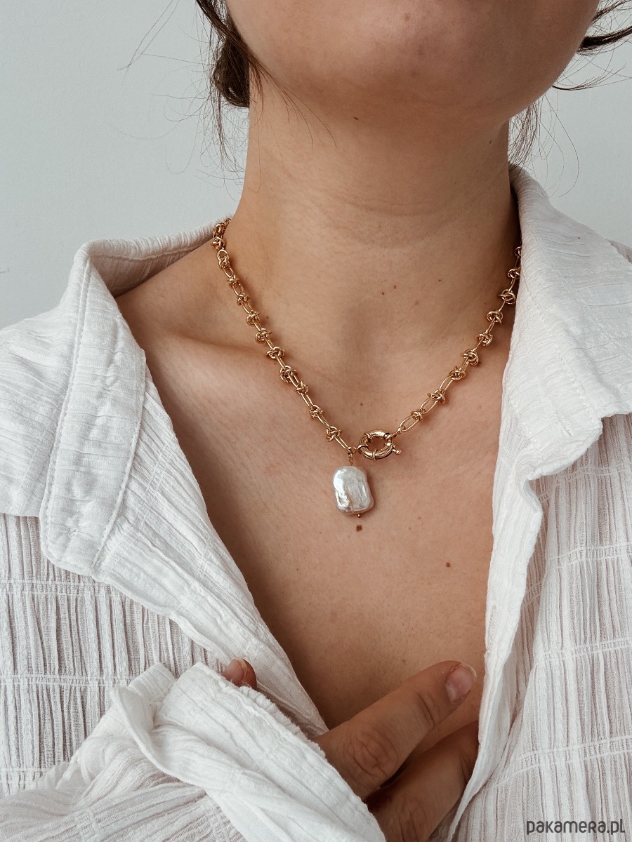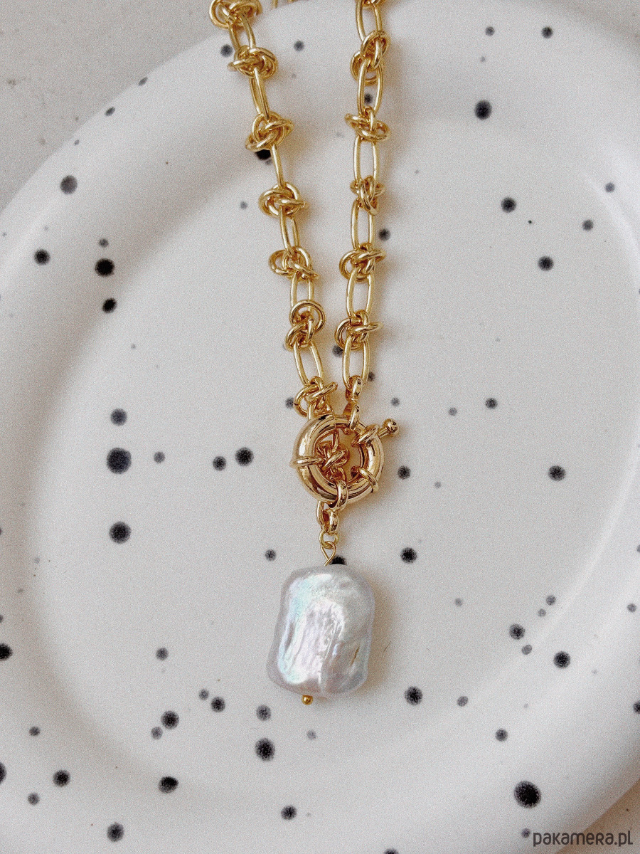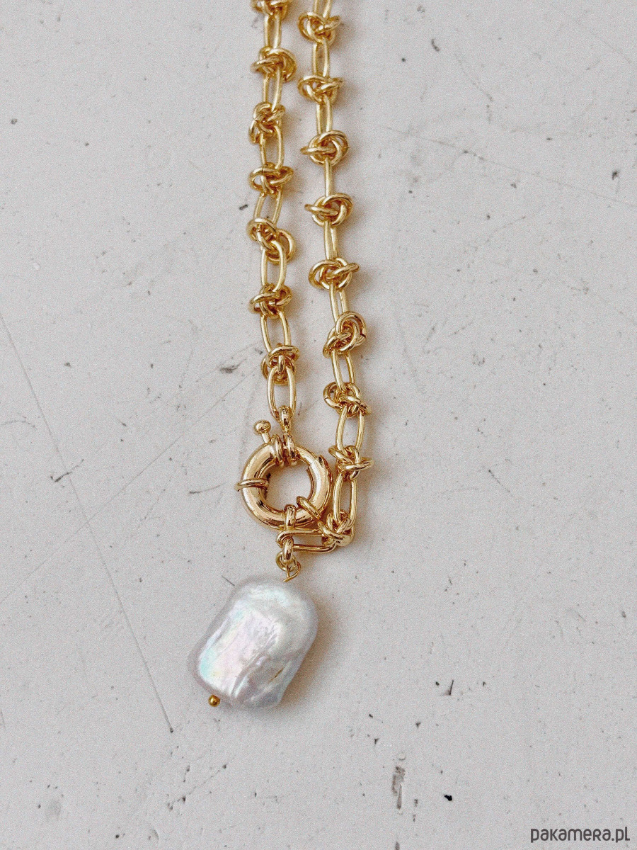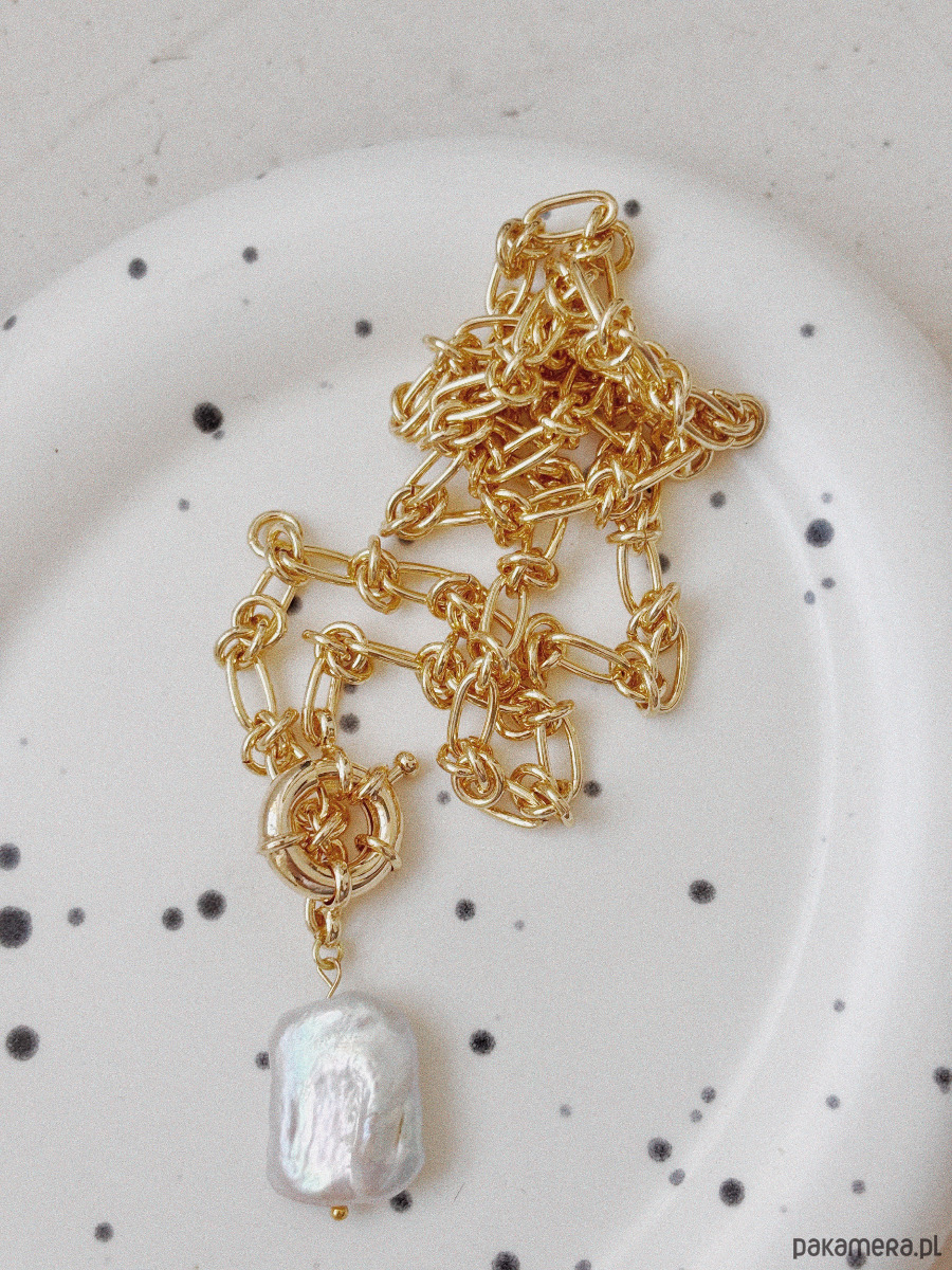 Naszyjnik wykonany jest łańcuszka,zapięcia rodowanego 14K złotem i zawieszki w formie perły naturalnej.