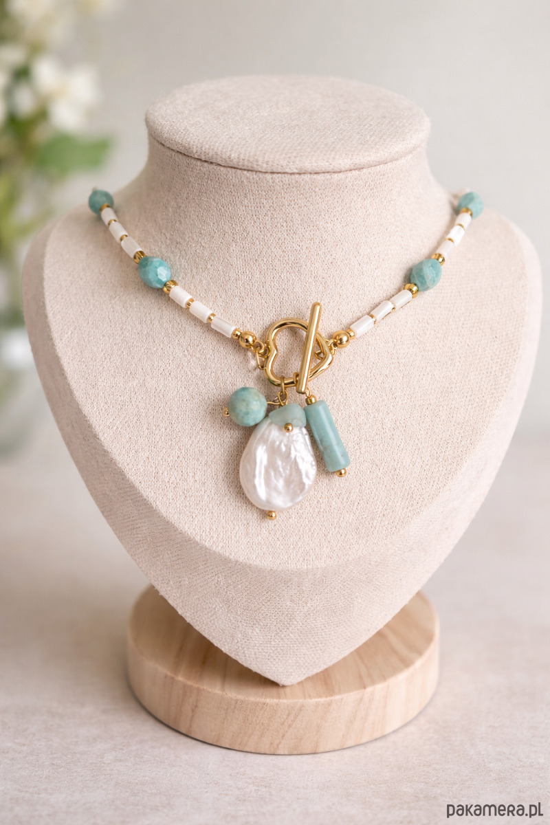 Połączenie amazonitu, masy perłowej i złotych detali tworzy subtelną, świeżą kompozycję - idealną na lato i nie tylko.