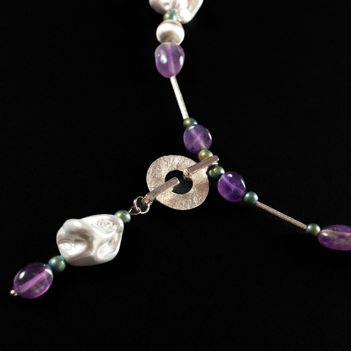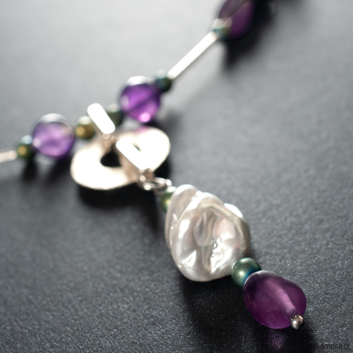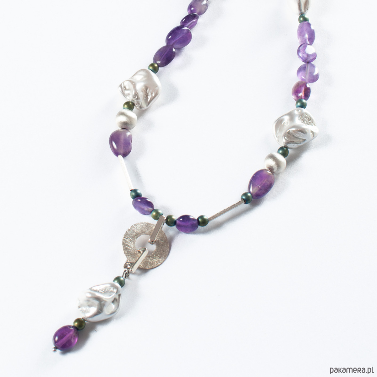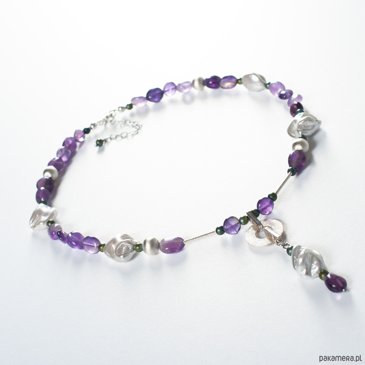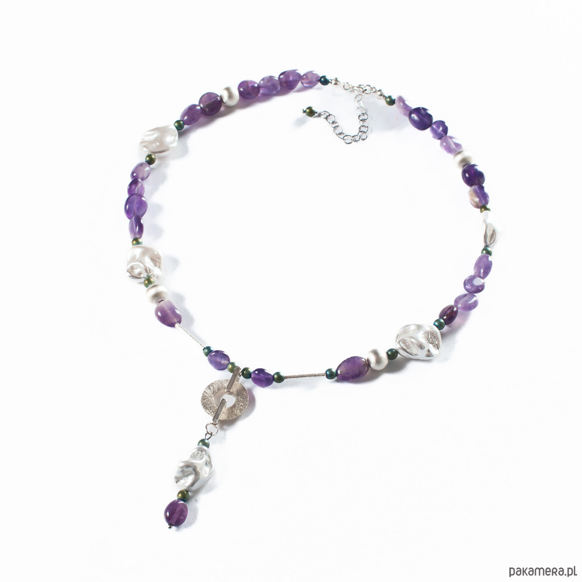 Naszyjnik z kolekcji JESTEŚ PERŁĄ z ametystami, nieregularnymi perłami seashell, hematytami i srebrem 925. Długość naszyjnika 42 cm + 5 cm - łańcuszek przedłużka. Naszyjnik wykonany ręcznie według własnego projektu w pracowni Anillito. Biżuterię przesyłamy w eleganckim kartoniku.