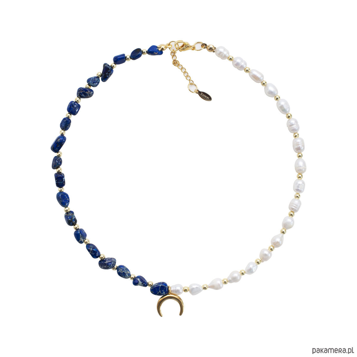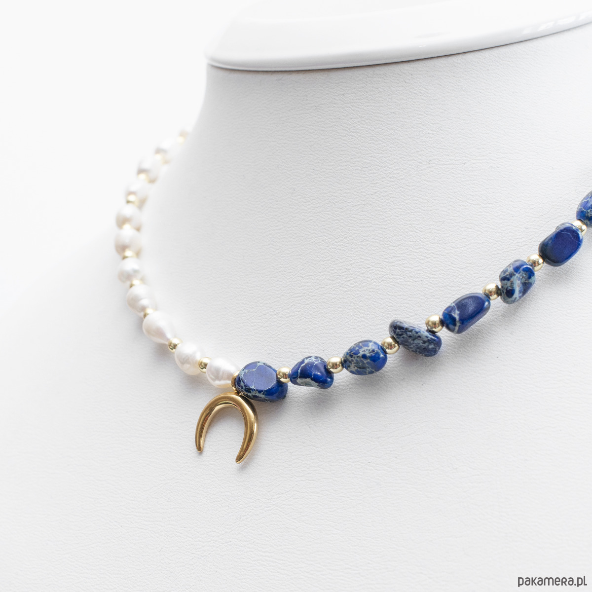 Kontrast klasycznych Pereł i nieregularnej faktury Jaspisu buduje wyrafinowany styl. Zawieszka w kształcie księżyca symbolizuje kobiecą cykliczność i delikatność, wzmacniając pozytywne emocje i poczucie własnej wartości. Jaspis jest kamieniem ochronnym i stabilizującym. Jego obecność wspiera jasność myśli oraz równowagę emocjonalną, pomagając w zachowaniu spokoju i intuicji, szczególnie w podejmowaniu decyzji. Złocony Hematyt przeplatany kamieniami dodaje luksusowego akcentu i uziemienia. Całość wykonana jest na trwałej lince z zapięciem ze stali nierdzewnej złoconej, co gwarantuje długotrwałą jakość i komfort noszenia.