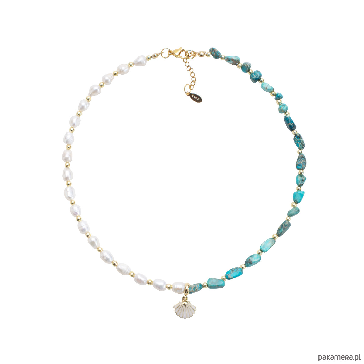 Prawdziwe Perły symbolizują czystość i mądrość, budząc pozytywne emocje i wewnętrzną harmonię. Złocona muszelka jako zawieszka podkreśla lekkość i beztroskę, idealną do celebrowania radości życia. Jaspis jest kamieniem równowagi i relaksu. Jego turkusowe odcienie pomagają w redukcji stresu i wspierają klarowność myśli, pomagając zachować spokój nawet w najbardziej dynamicznych dniach. Złocony Hematyt przeplatany kamieniami dodaje luksusu i uziemienia. Całość, wykonana na trwałej lince z zapięciem ze stali nierdzewnej złoconej, gwarantuje długotrwałą jakość i poczucie bezpieczeństwa. To biżuteria równie solidna, co urzekająca.
