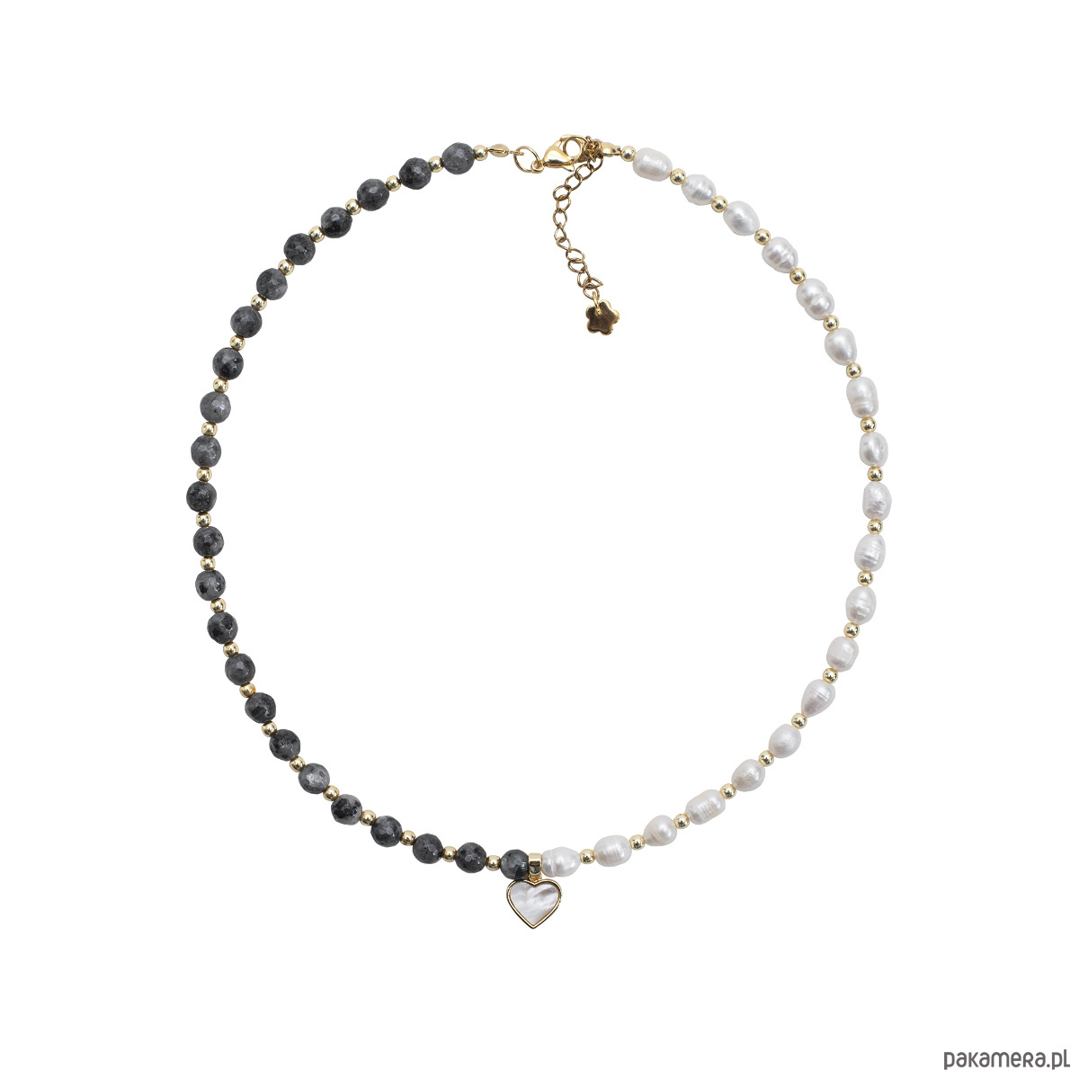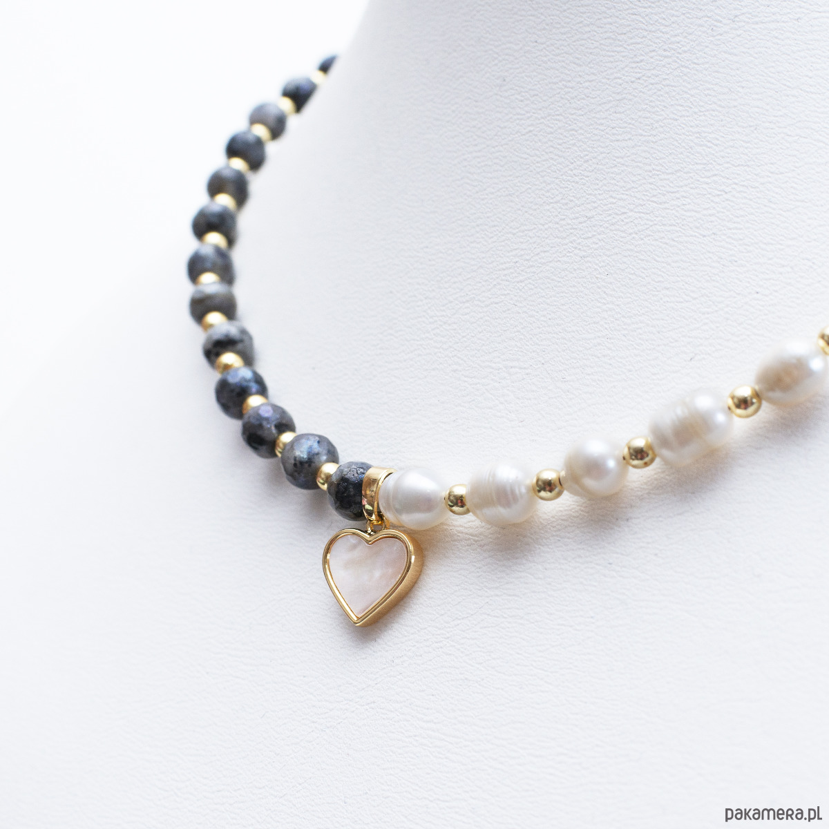 Centralna zawieszka – serduszko z perłową masą – to bezpośredni symbol wrażliwości i miłości. W połączeniu z Perłami, naszyjnik ten wzmacnia poczucie harmonii i sprzyja pozytywnym emocjom. Labradoryt jest kamieniem transformacji i intuicji. Jego charakterystyczny blask pomaga w zachowaniu jasności umysłu i pozwala na podejmowanie decyzji w zgodzie z wewnętrzną mądrością. Złocony Hematyt przeplatany kamieniami dodaje luksusowego akcentu i uziemienia. Całość wykonana jest na trwałej lince z zapięciem ze stali nierdzewnej złoconej, co gwarantuje długotrwałą jakość i komfort noszenia.
