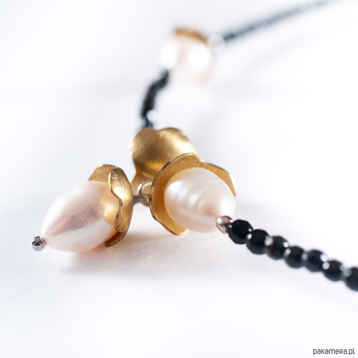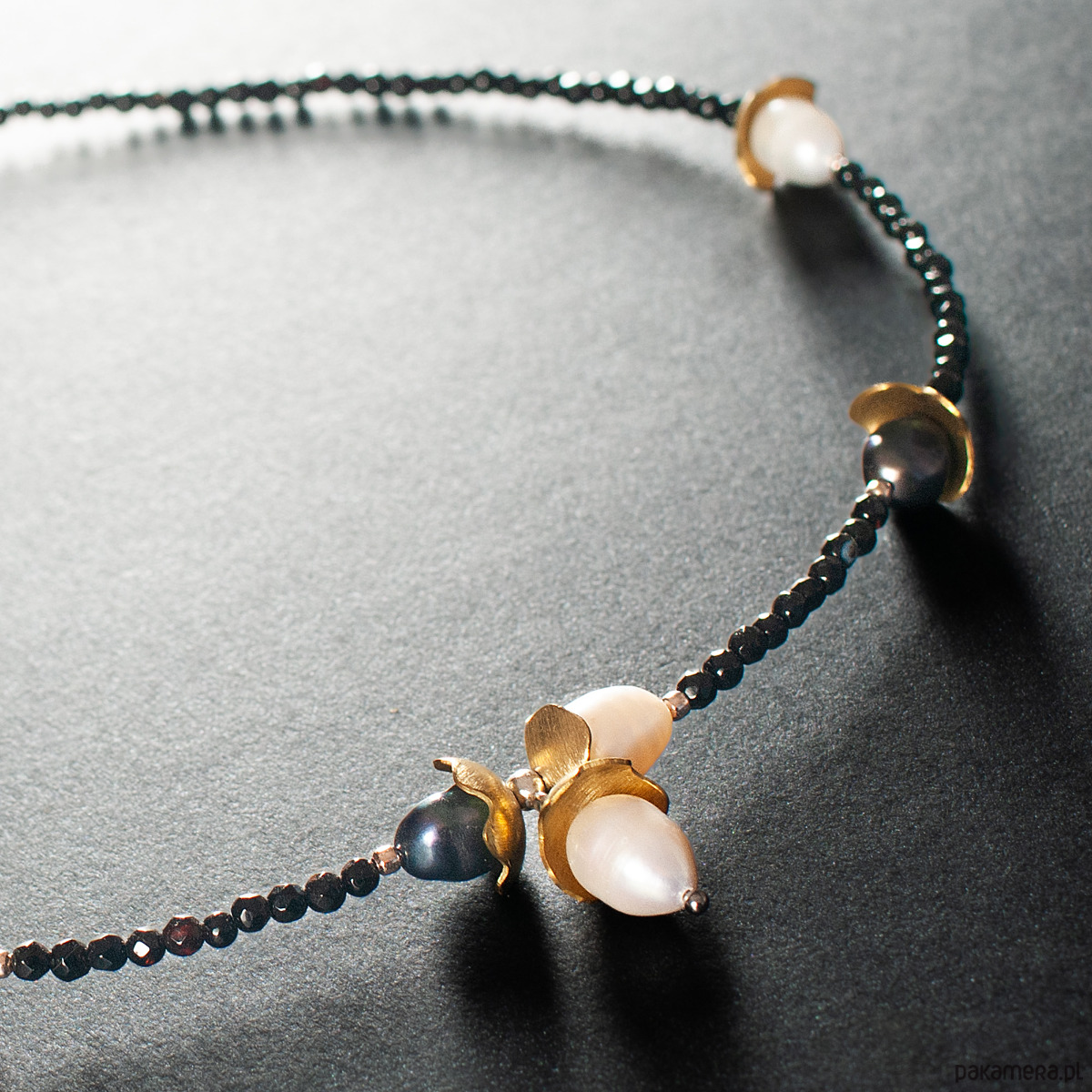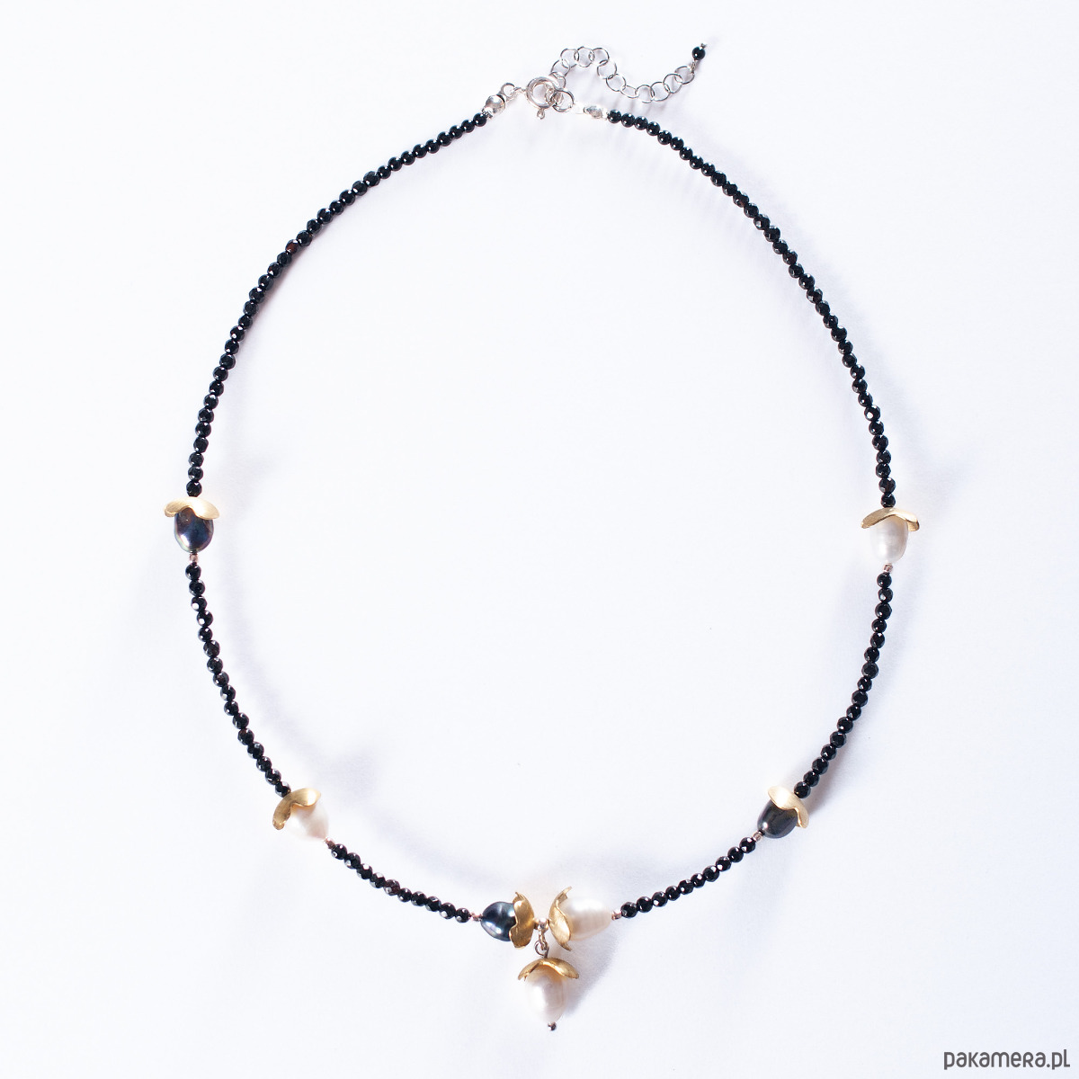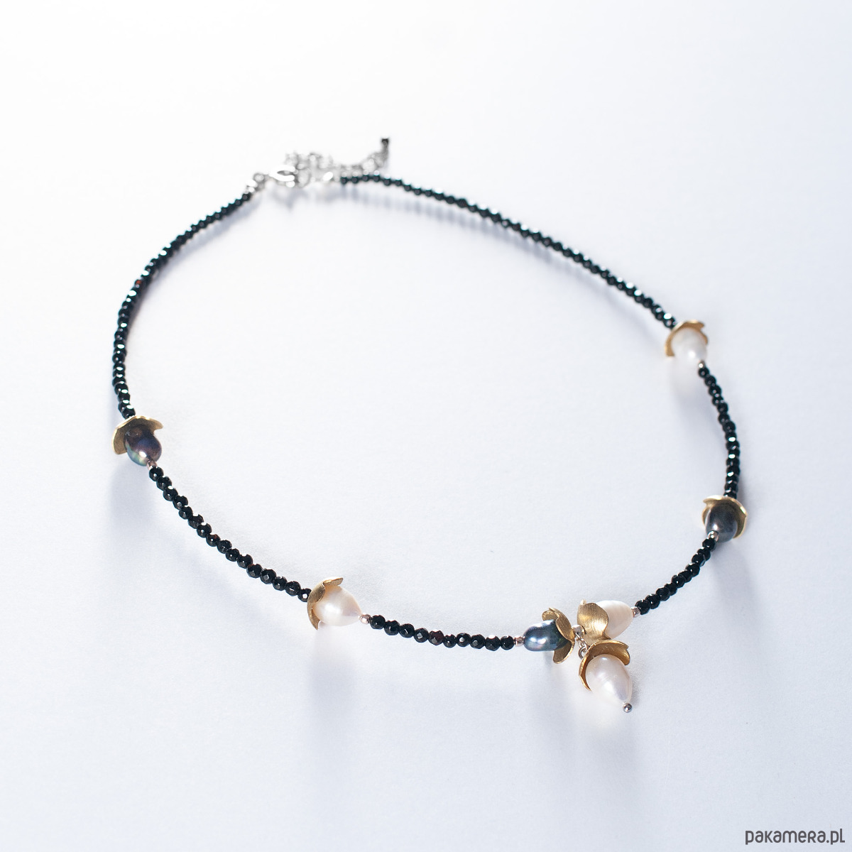 Uroczy naszyjnik z kolekcji JESTEŚ PERŁĄ. Przepiękne perły słodkowodne w białym i ciemnoszarym kolorze w otoczeniu kwiatków z mosiądzu stanowią delikatny motyw roślinny. Pojawia się on posród czarnych, drobnych fasetowanych onyksów. Piękny i klasyczny wygląd naszyjnika sprawia, że będzie on idealnie pasował na wyjątkowe okazje. Długość naszyjnika: 45,5 cm + 5 cm. Skład: kamienie naturalne 85 %, srebro 925 2%, stal szlachetna 3%, mosiądz 10%. Biżuterię wykonujemy ręcznie, według własnego projektu w pracowni Anillo. Naszyjnik starannie zapakujemy i prześlemy w eleganckim kartoniku.