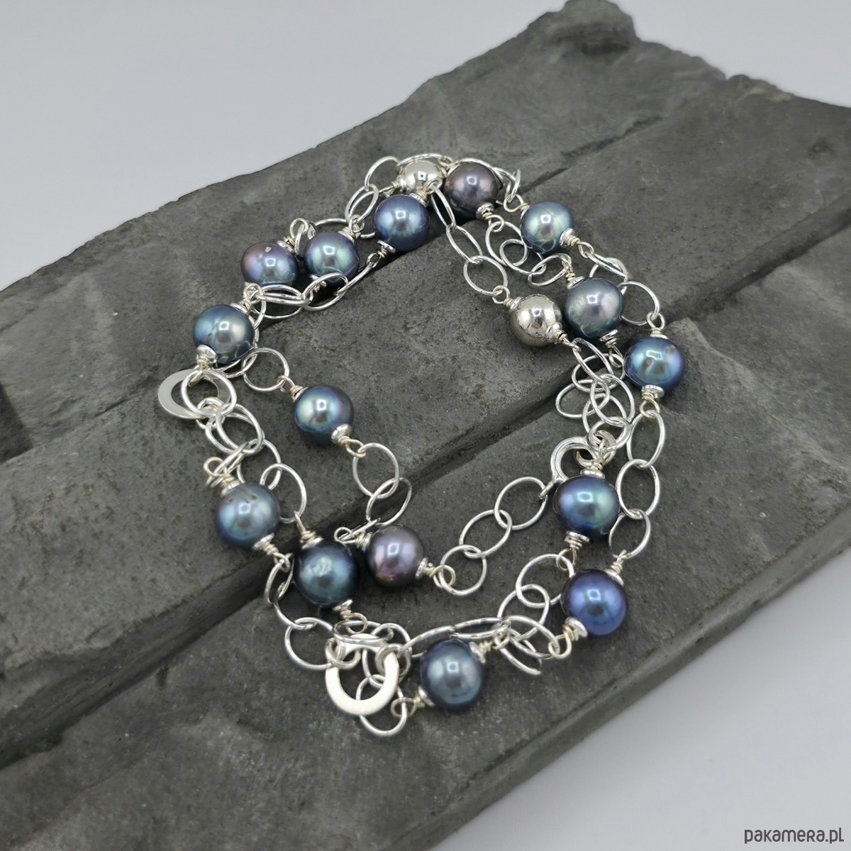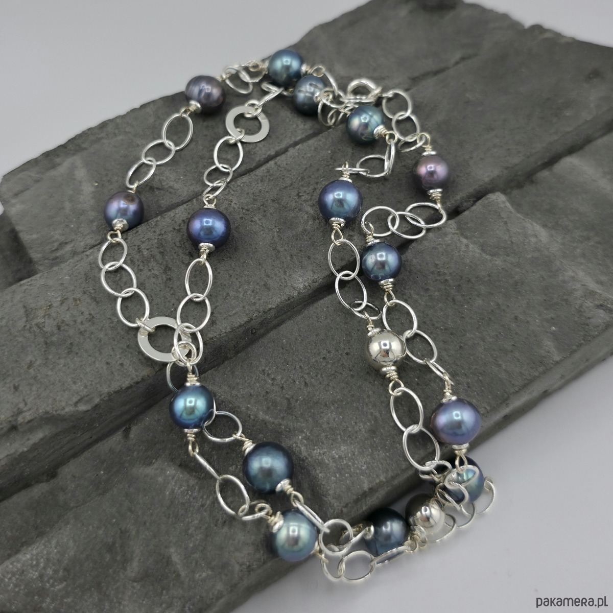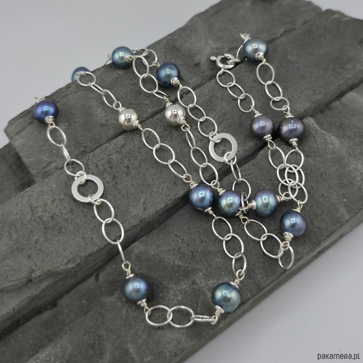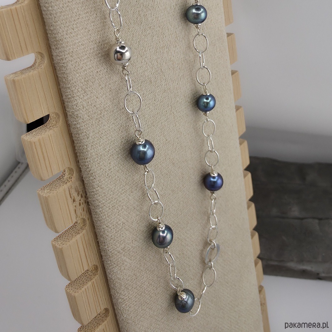 Kobiecy, elegancki naszyjnik na każdą okazję. Wykonany w całości ze srebra próby 925 oraz wysokiej jakosci naturalnych pereł słodkowodnych wielkości ok. 0,8 cm. Perły opalizuja ba niebiesko-fioletowo-szaro. Łańcuszek posiada duze ogniwa wielkości 5x7 mm. Całkowita długość naszyjnika to ok. 68,5 cm. Na życzenie mogę go zoksydować. Ozdobnie zapakowany.