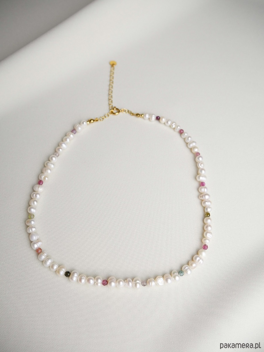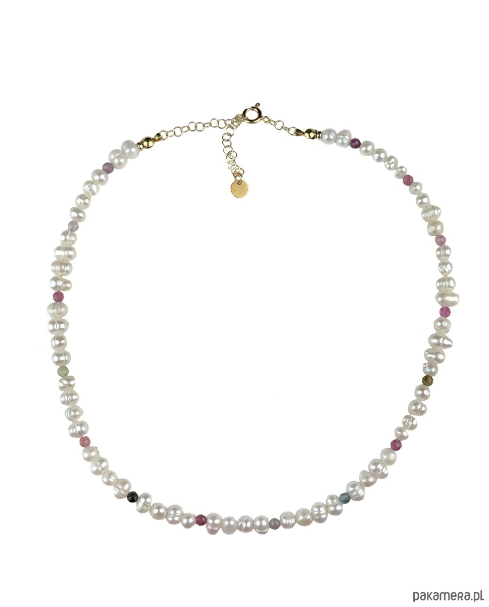 Naszyjnik z naturalnych, kremowych pereł skomponowanych z kolorowymi turmalinami. Dodatkowe elementy srebrne próby 925, pokryte 24 k złotem.