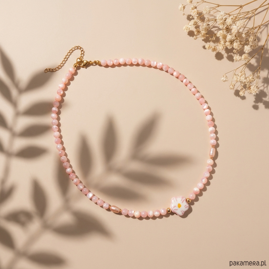 Romantyczny i delikatny naszyjnik z pereł, masy perłowej i hematytów ozdobiony uroczym, ceramicznym kwiatem.